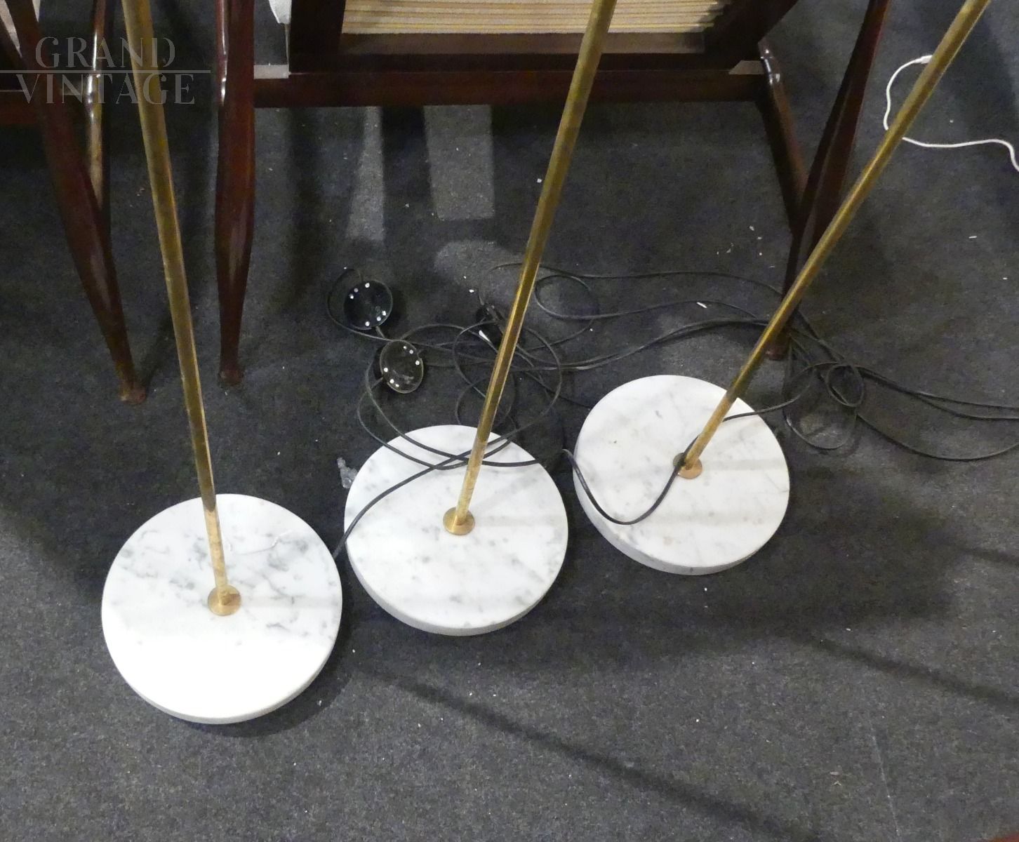 Triptych of Lamter floor lamps, with marble base, brass stem and plexiglass lampshade shaded from transparent to smoky, with white lacquered metal core.