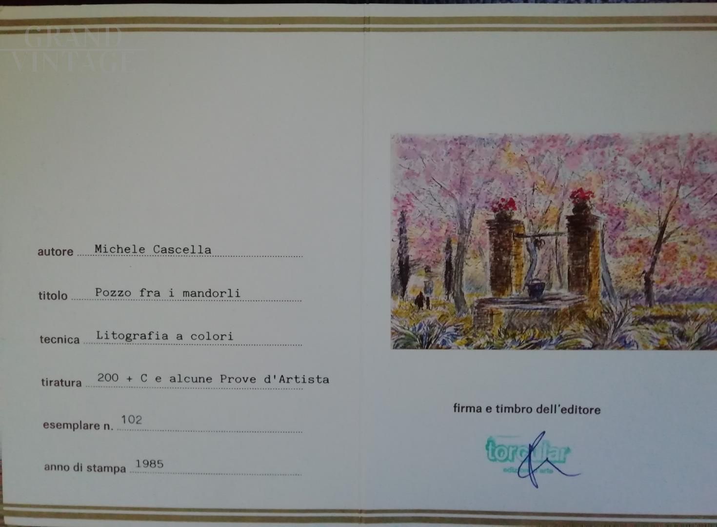 Well among the Almond Trees, lithograph by Michele Cascella, signed and dated 1985, 50 x 70 cm, Torcular edition.