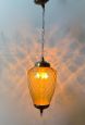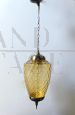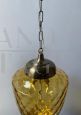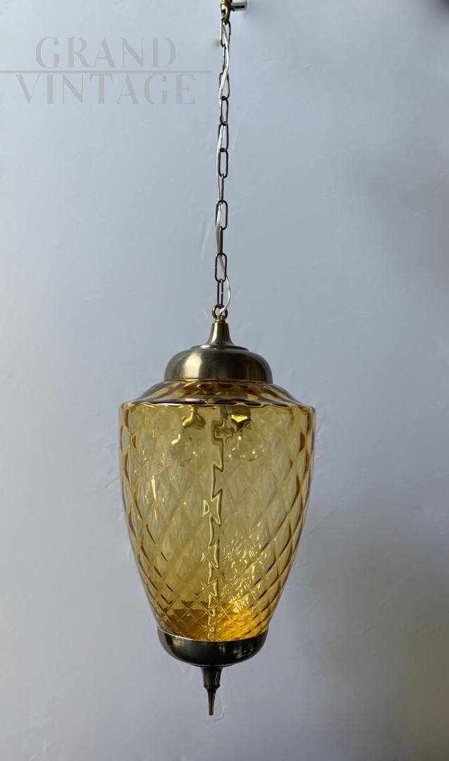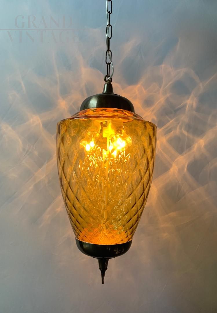 Lantern pendant lamp in decorated amber colored Murano glass, 1950s, with 3 lights with E14 bulbs. The chandelier is in excellent condition, it was completely disassembled, cleaned and reassembled, and the wires and lamp holders were replaced, in short, it is electrically and aesthetically like new. Uncracked glass, few signs of wear overall. More pieces available on request. Excellent piece of design to brighten any environment.