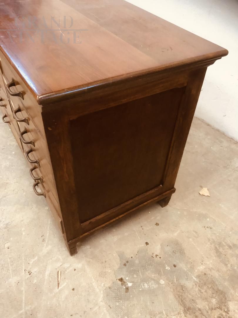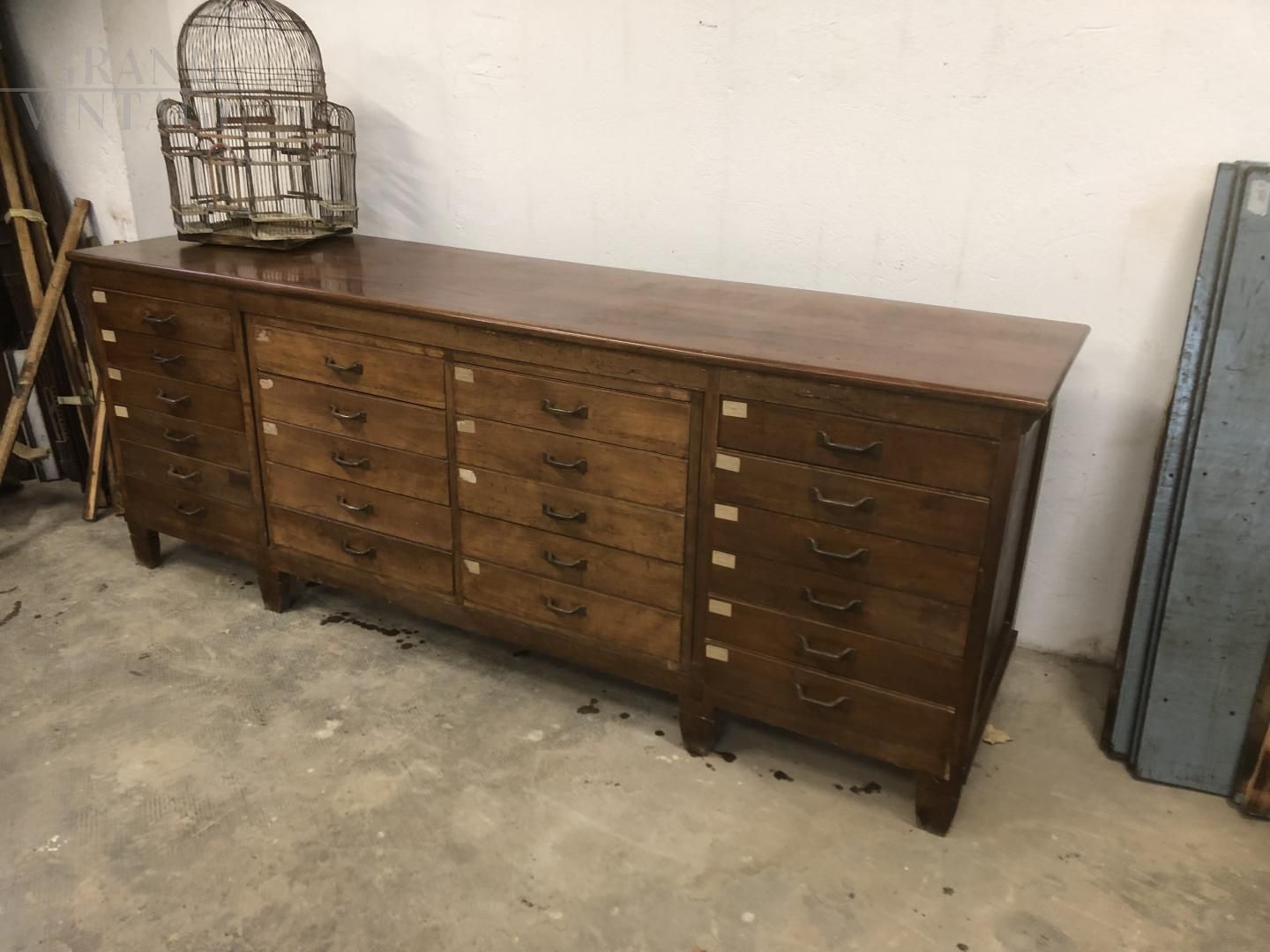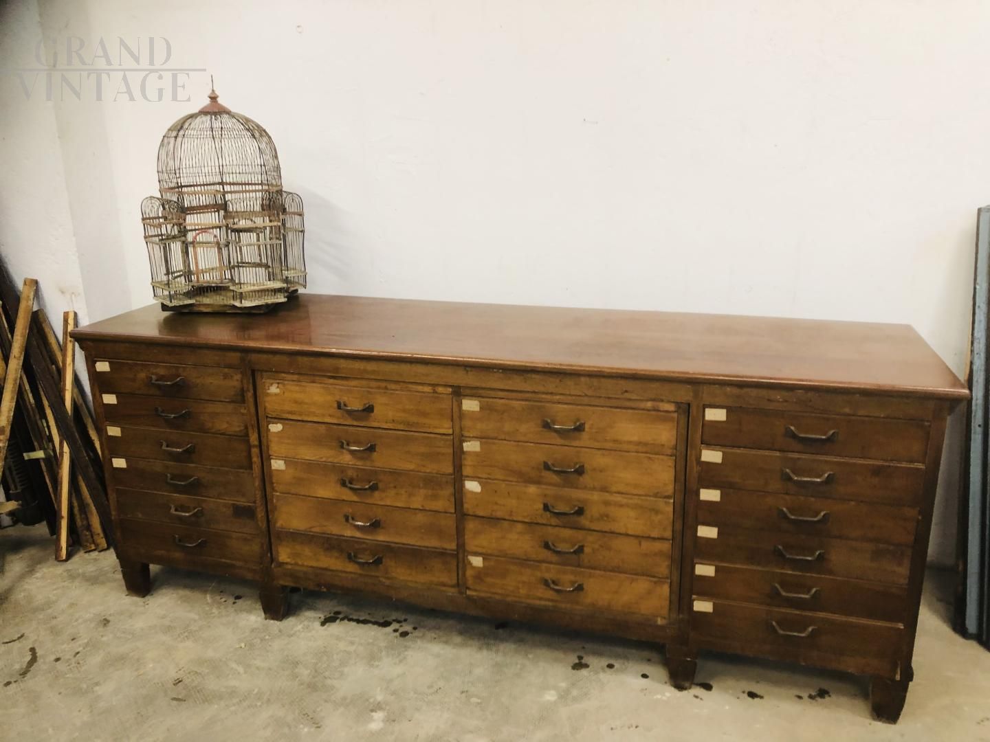 Large 1950s haberdashery counter chest of drawers with 24 drawers, for the center of the room.