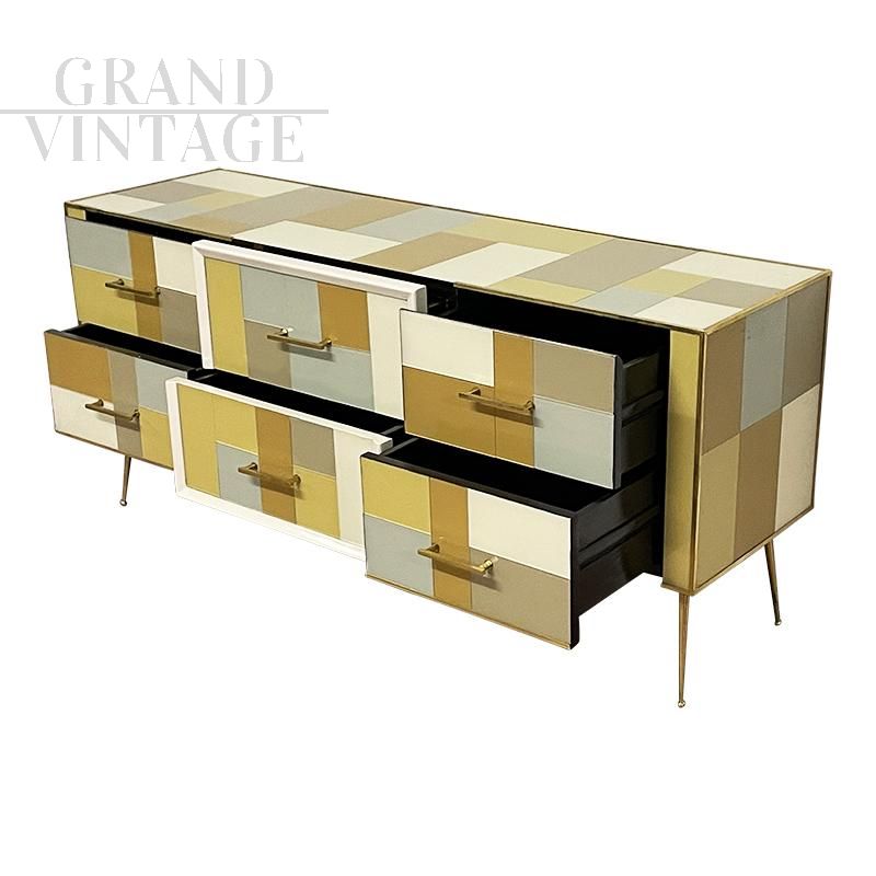 Large low design dresser with six drawers entirely handmade, with wooden structure covered in glass in mustard, yellow, grey; profiles, finishes, handles and feet in golden brass, front relief in white wood, equipped with internal shelf.