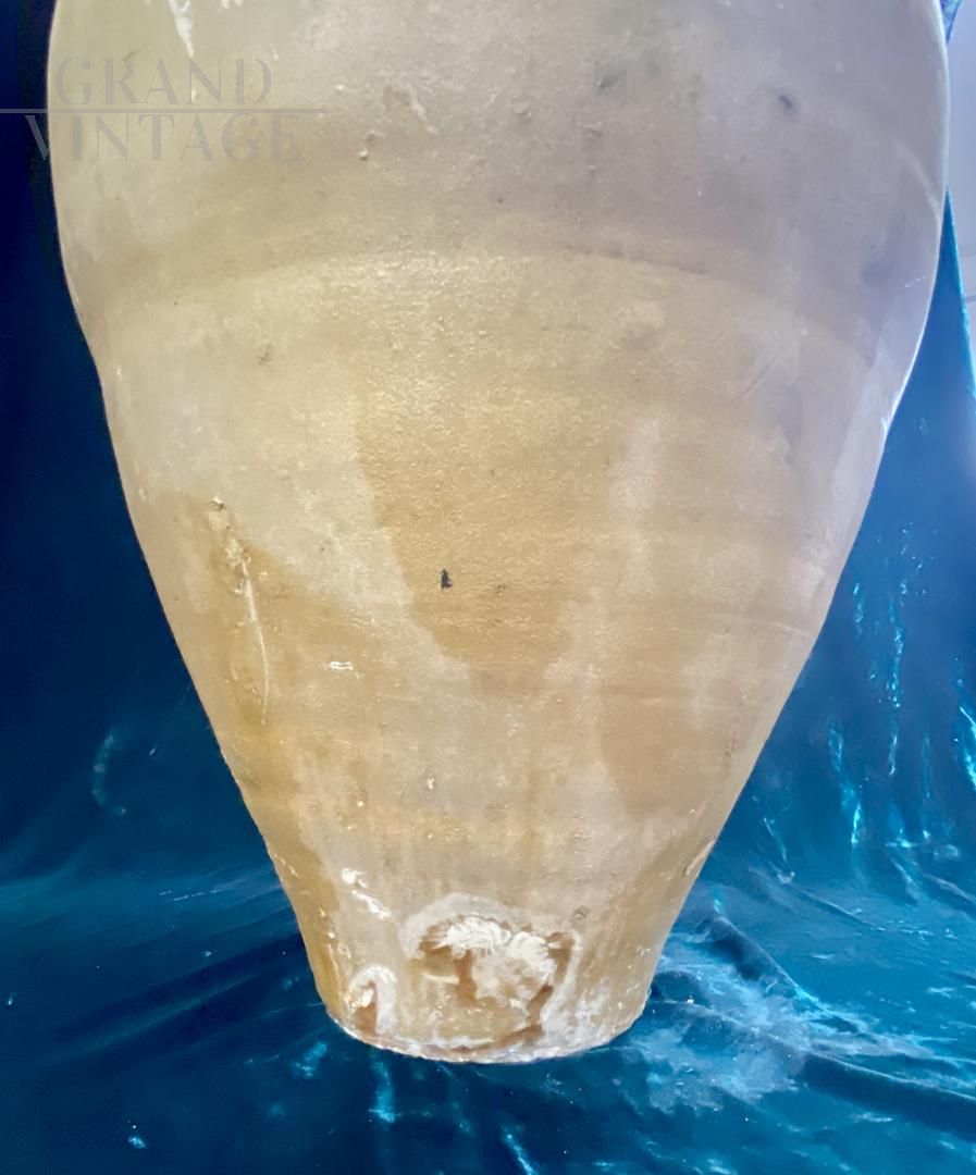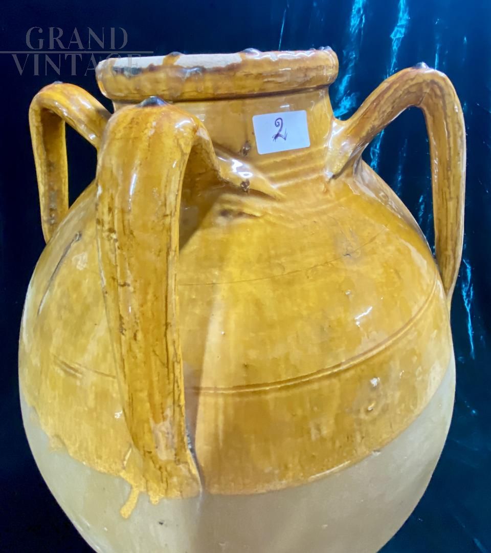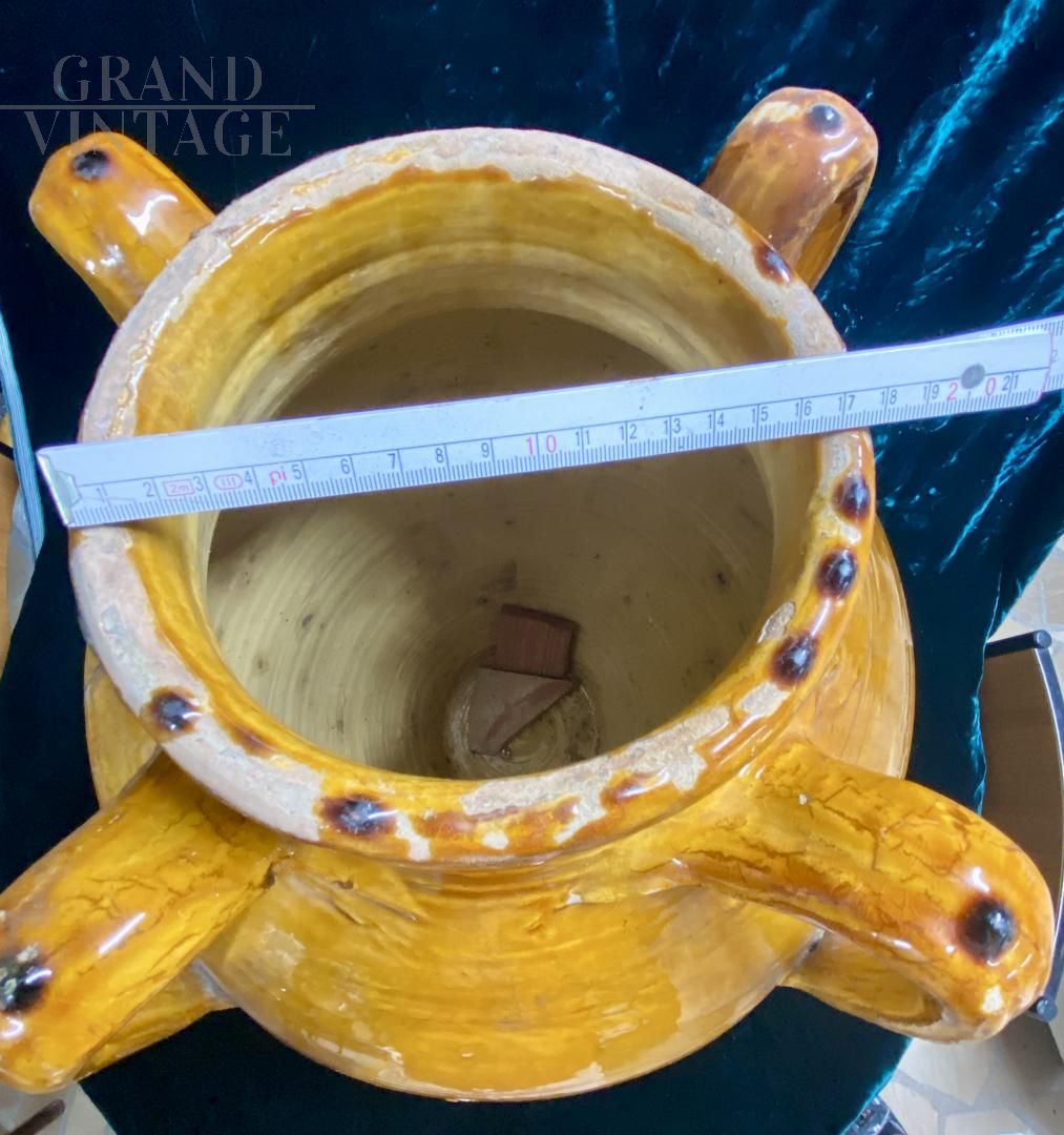 The capasone features four sturdy handles for easy handling, and the honey-colored glaze on the upper portion features beautiful natural drippings that enhance its authenticity. The unglazed lower portion is typical of the original workmanship. An authentic piece of Apulian peasant art, ideal for collectors, rustic furnishings, farmhouses, agritourisms, or as a striking decorative element. In good condition, with natural signs of aging that testify to its authenticity.