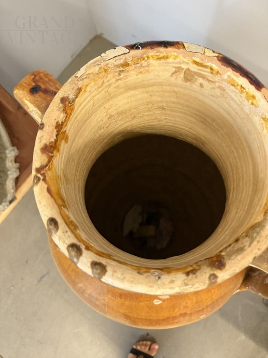 A large, antique Apulian "Capasone" jar from the 19th century, featuring a beautiful amphora shape with handles on the sides, used as an oil container. Measuring 106 x 55 cm, it is made of glazed terracotta and is a decorative item for both indoor and outdoor use. In good condition.