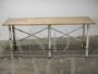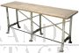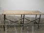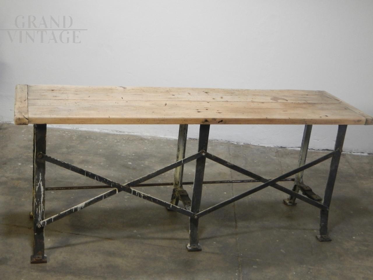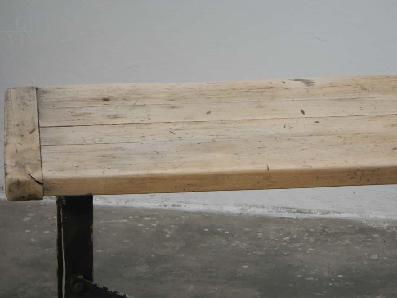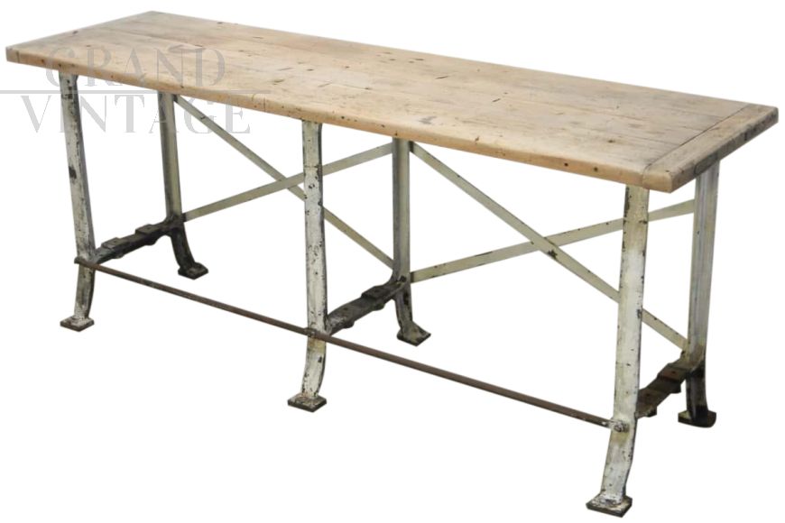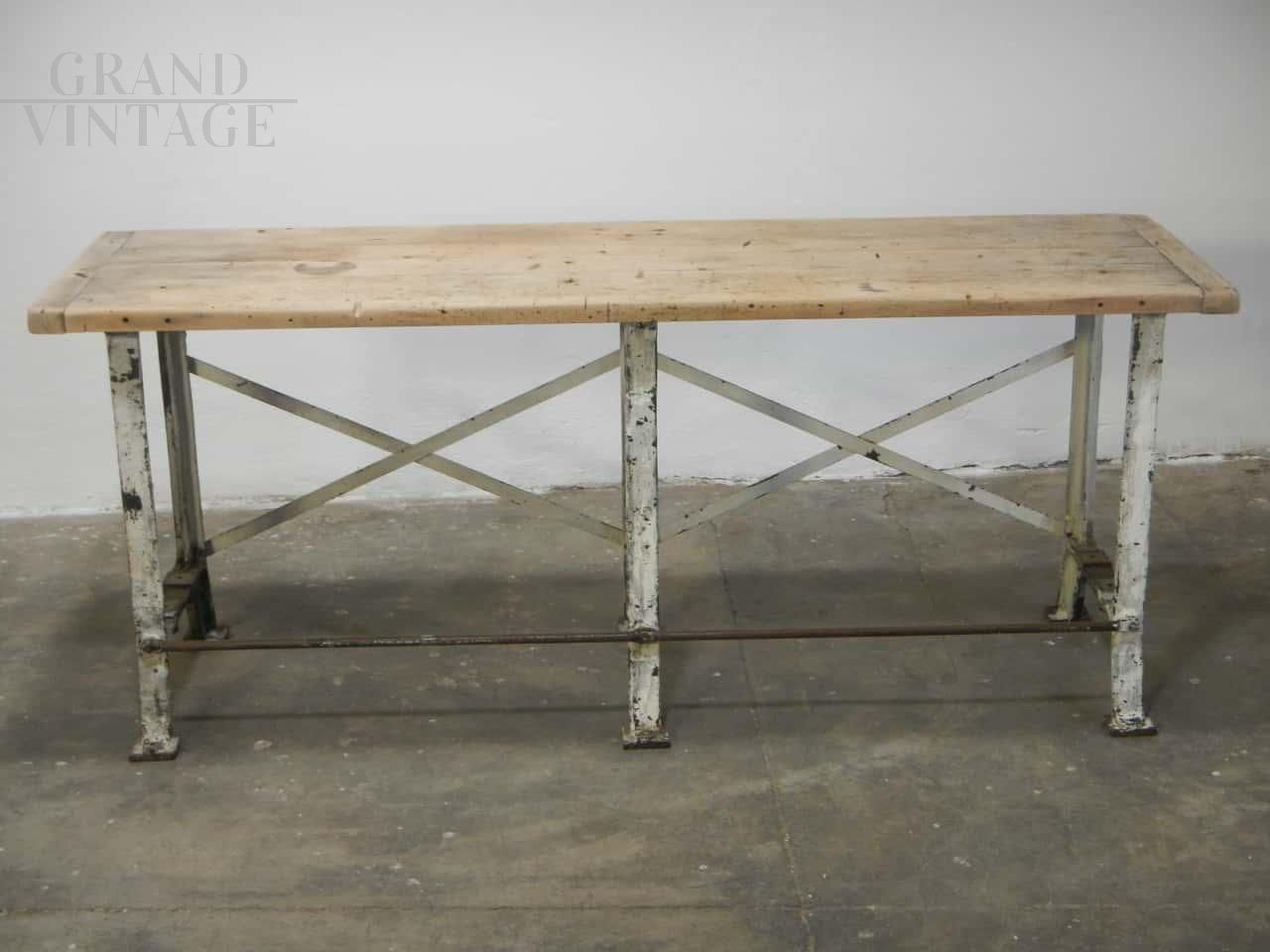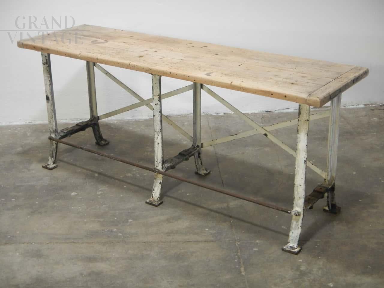 Large antique workbench table from the 1920s with white lacquered cast iron structure and beech top. The table has been restored.
