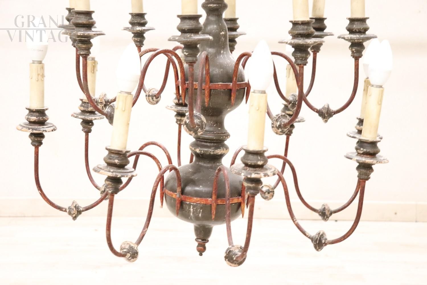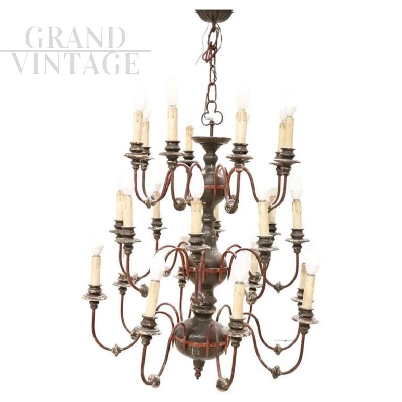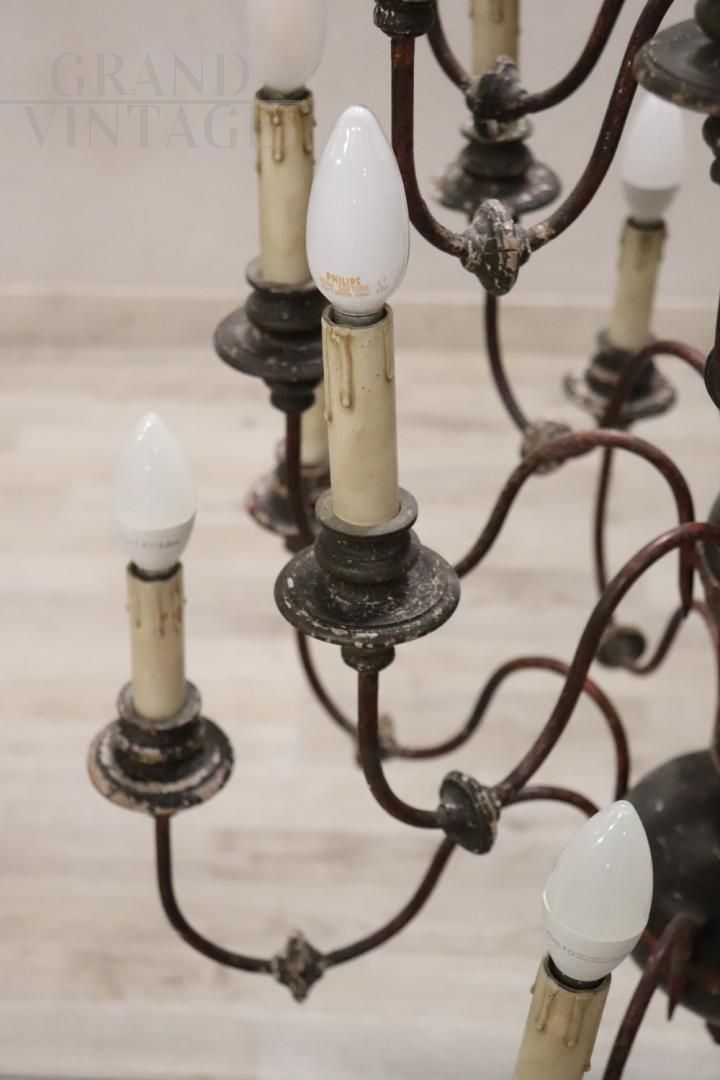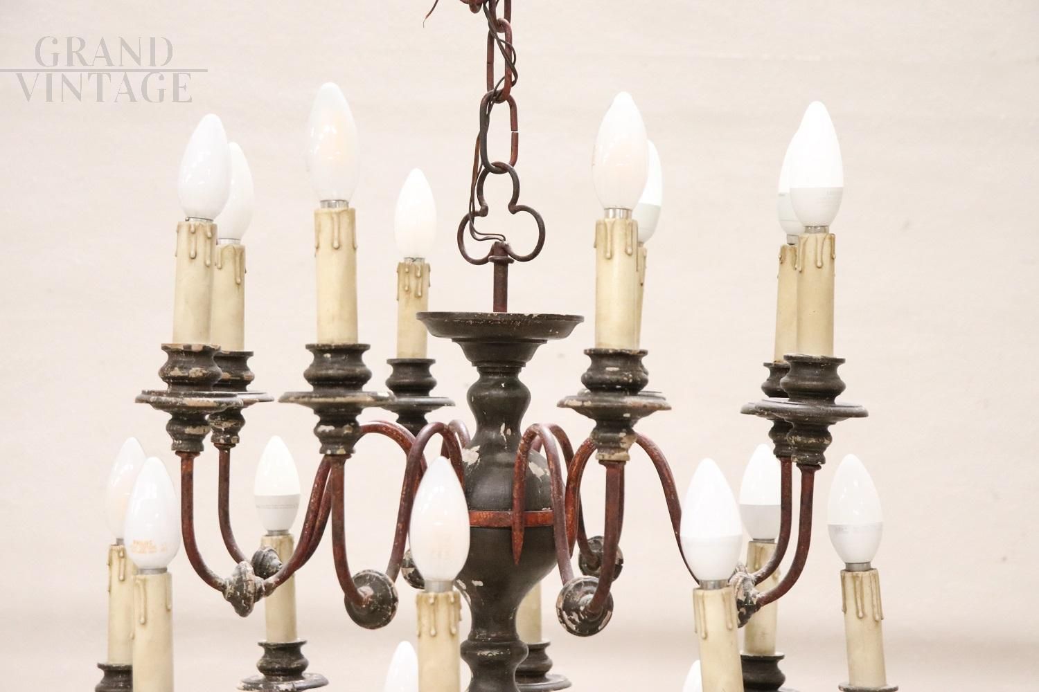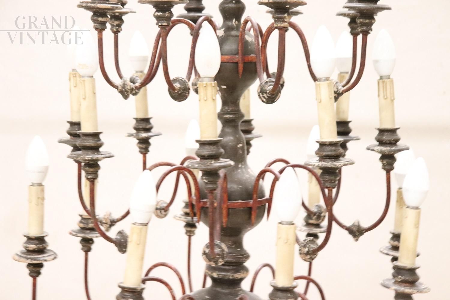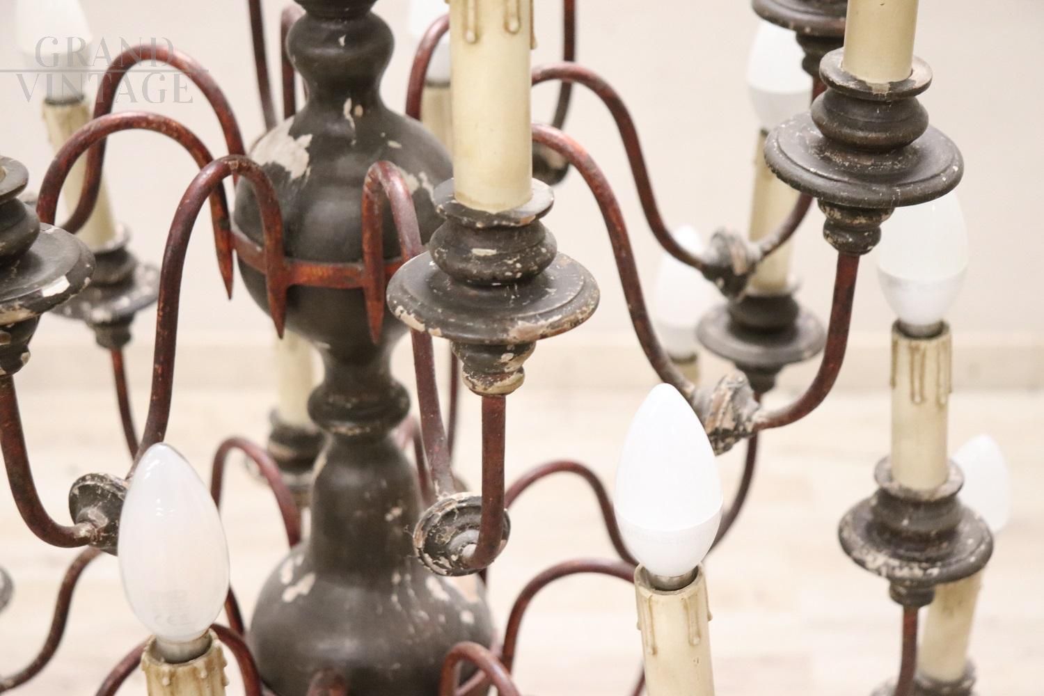 Large antique chandelier in wood and iron, early 20th century, with 24 lights