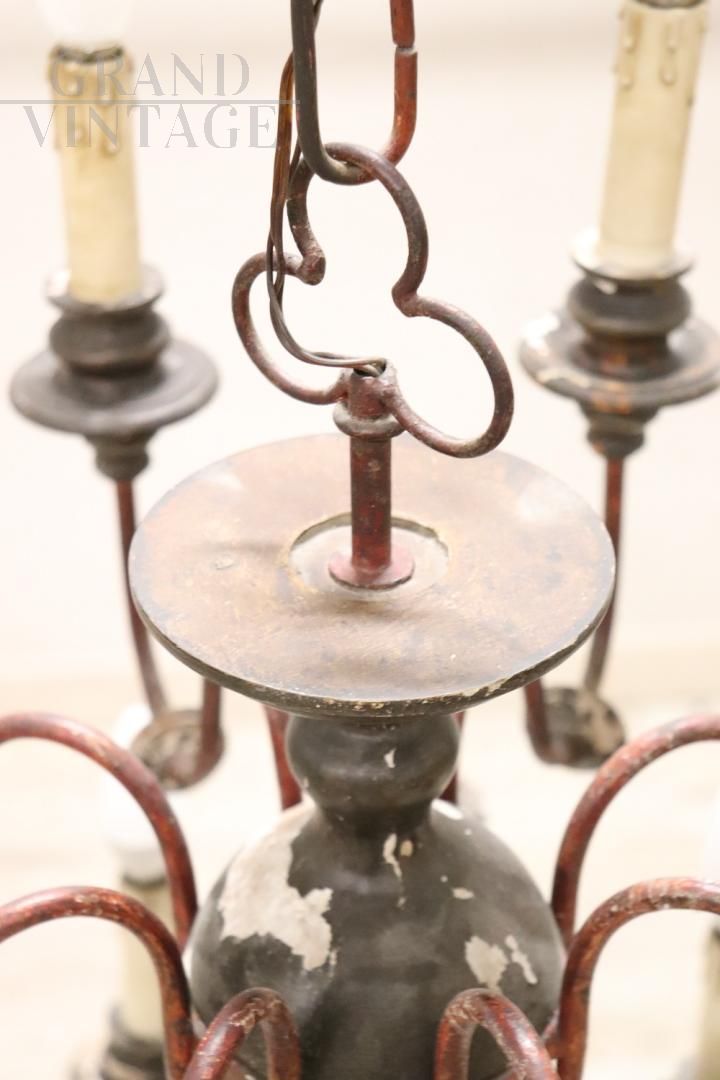 Large antique rustic chandelier in wood and iron from the early 20th century, with twenty-four bulbs arranged on three rows. This majestic antique chandelier is made of lacquered wood with dark red lacquered iron arms. It is a large chandelier, perfect to be placed in a large room of the house, above a dining table; the twenty-four bulbs will allow excellent lighting in large rooms. The total height of the chandelier can be modified by adding or removing links to the iron chain. Height of the chandelier without chain 84 cm. The electrical system has been checked and is in working order. The chandelier is antique and has some gaps in the lacquering which increase its charm over time.