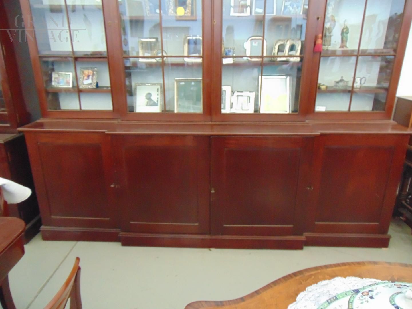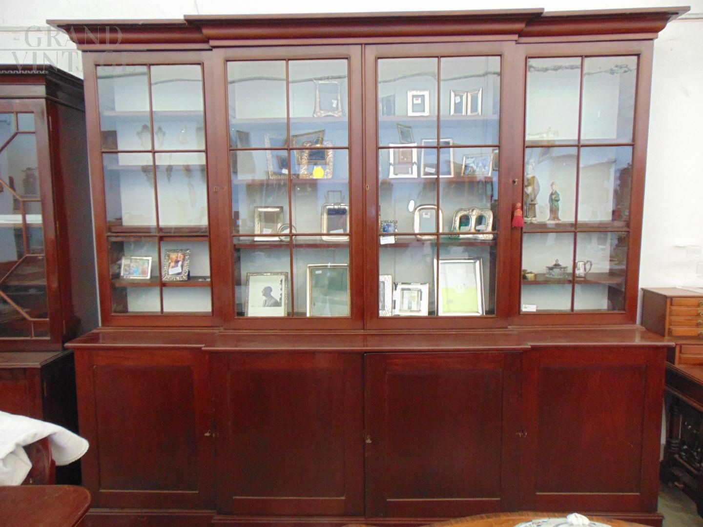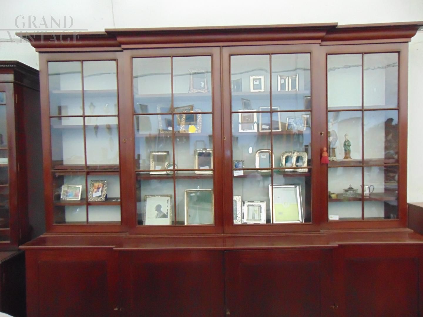 Antique English Victorian bookcase in mahogany with 4 glazed doors, in good condition, with some signs of wear.
