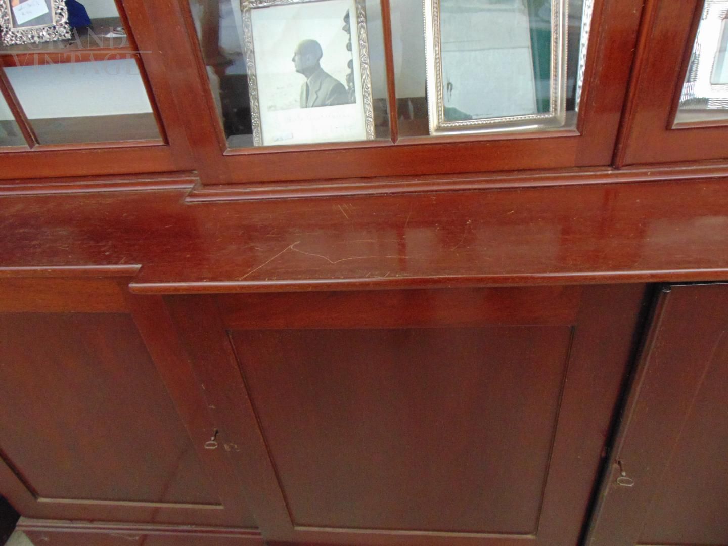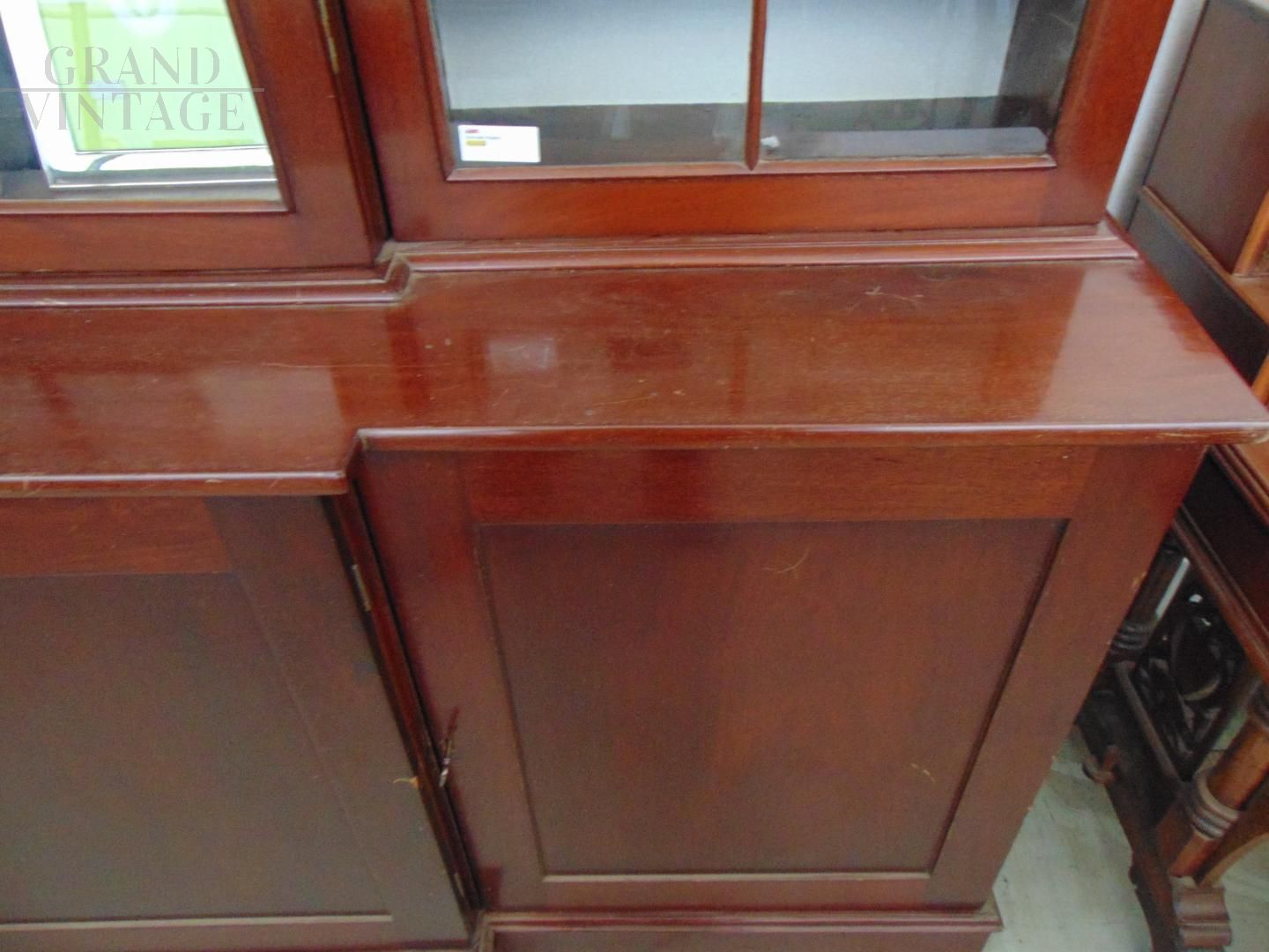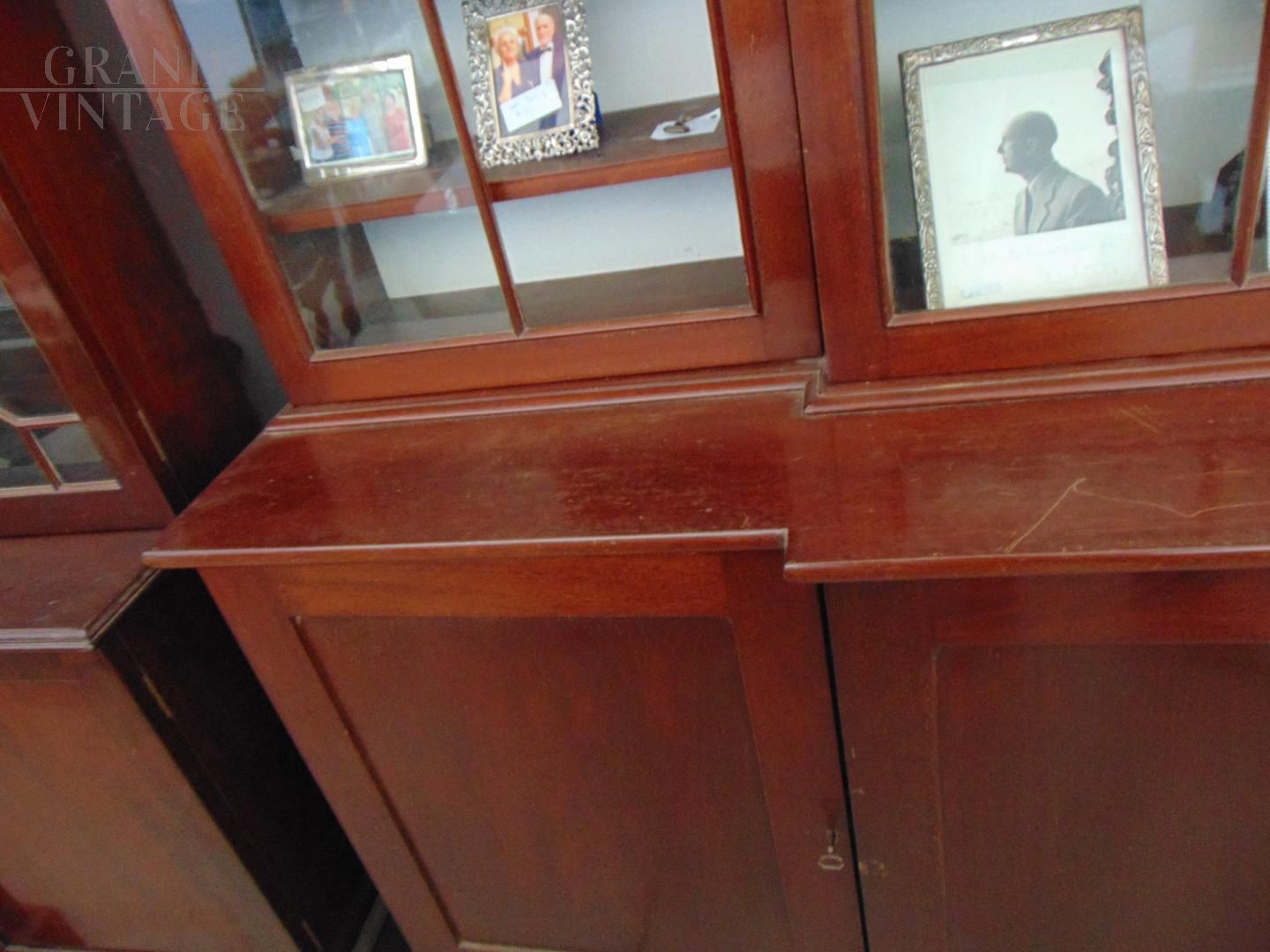 Antique English Victorian bookcase in mahogany with 4 glazed doors, in good condition, with some signs of wear.