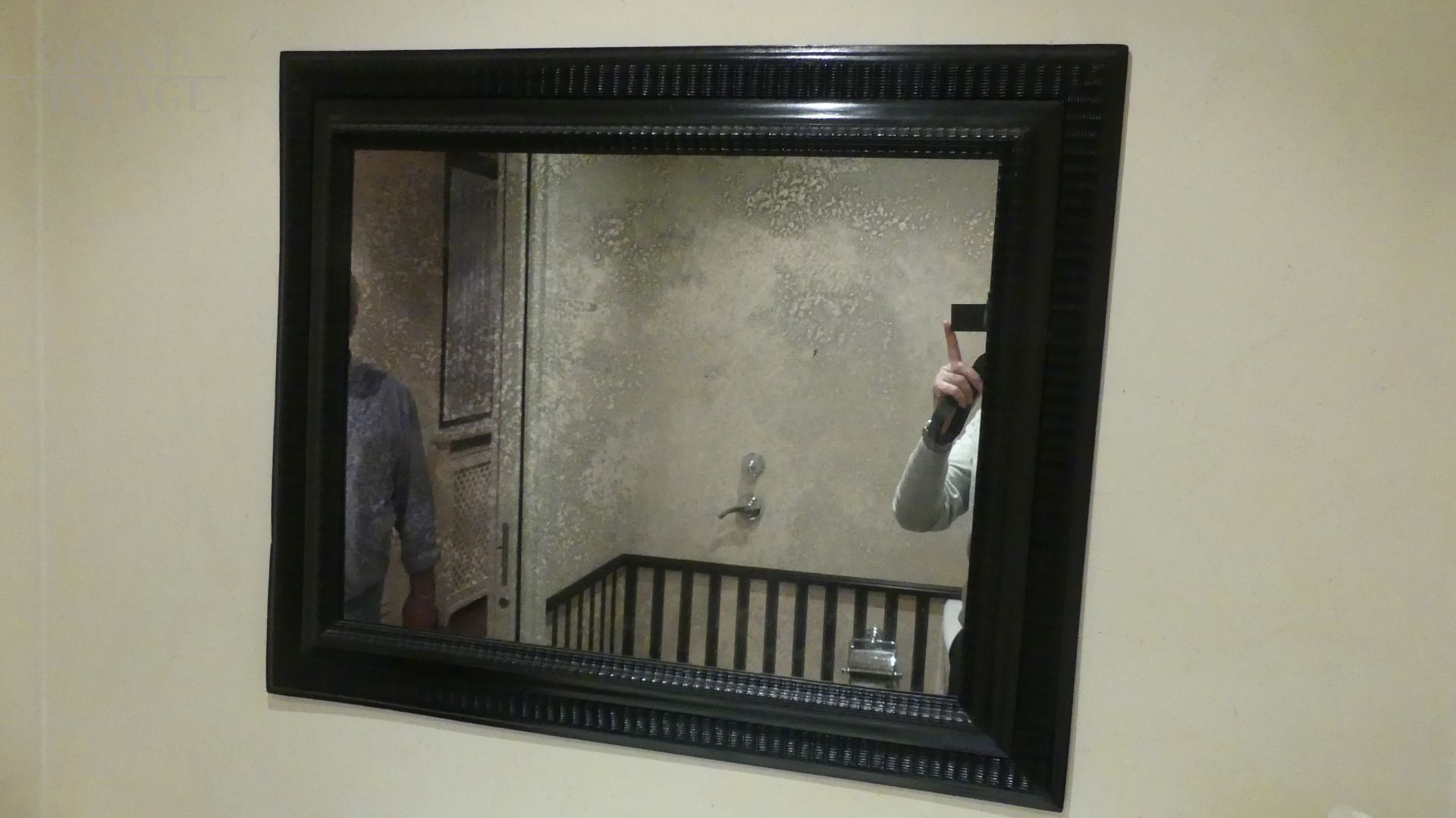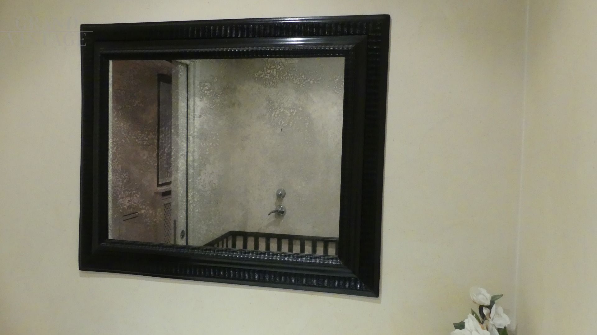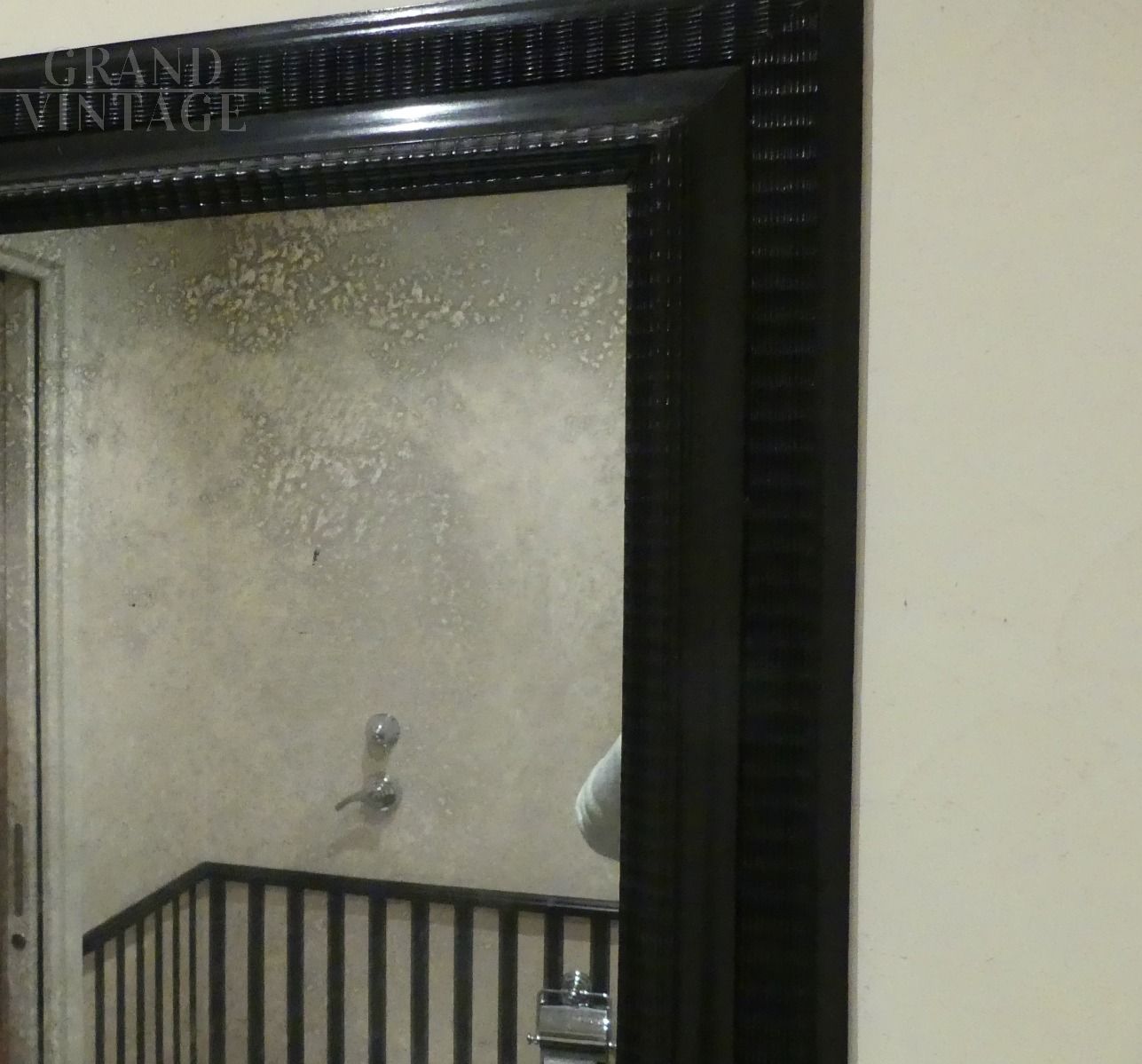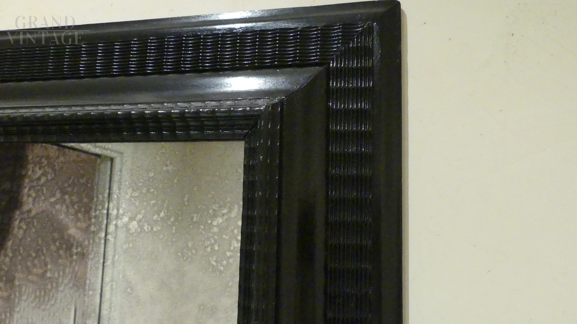 Large original antique Guilloché mirror, finely carved on wood, with the characteristic black color. Mercury mirror. In excellent condition.