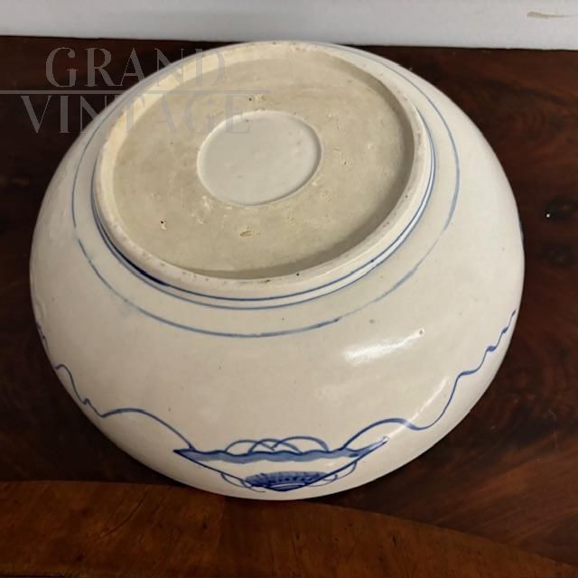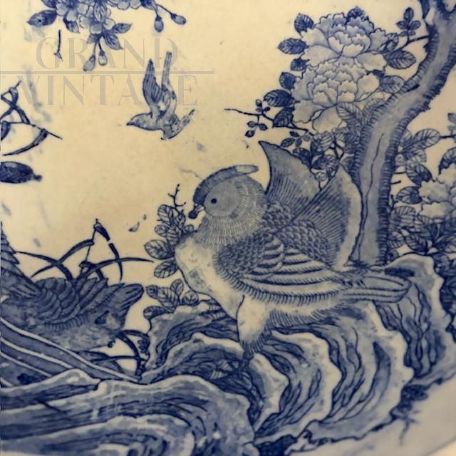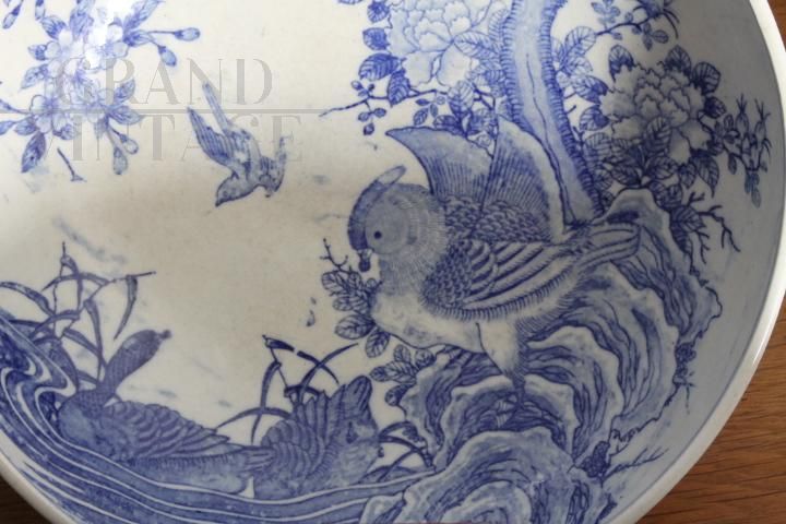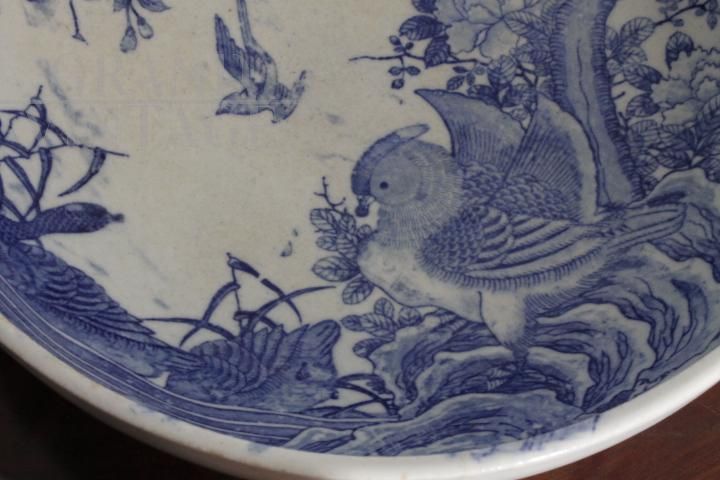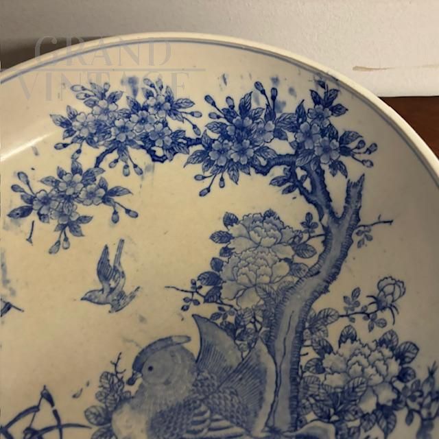 Large antique plate in white Japanese porcelain hand painted with partridge and floral motifs in blue, dating back to the Meiji period - 1868 - 1912. Beautiful and in excellent condition.