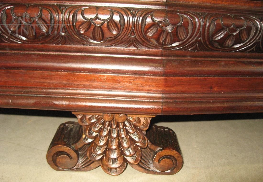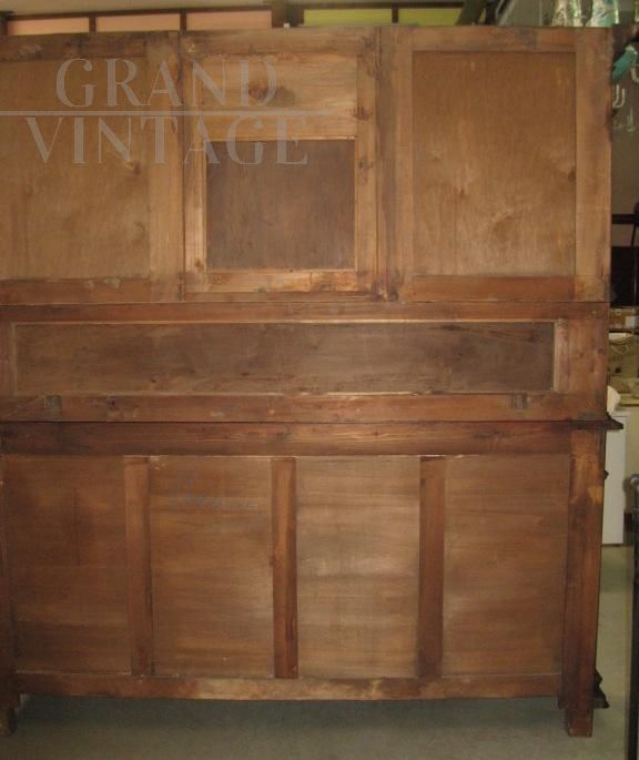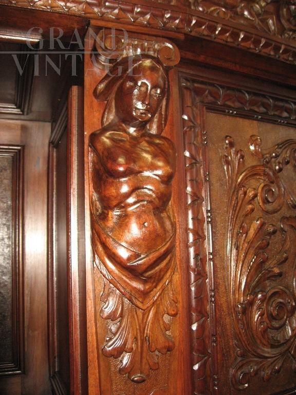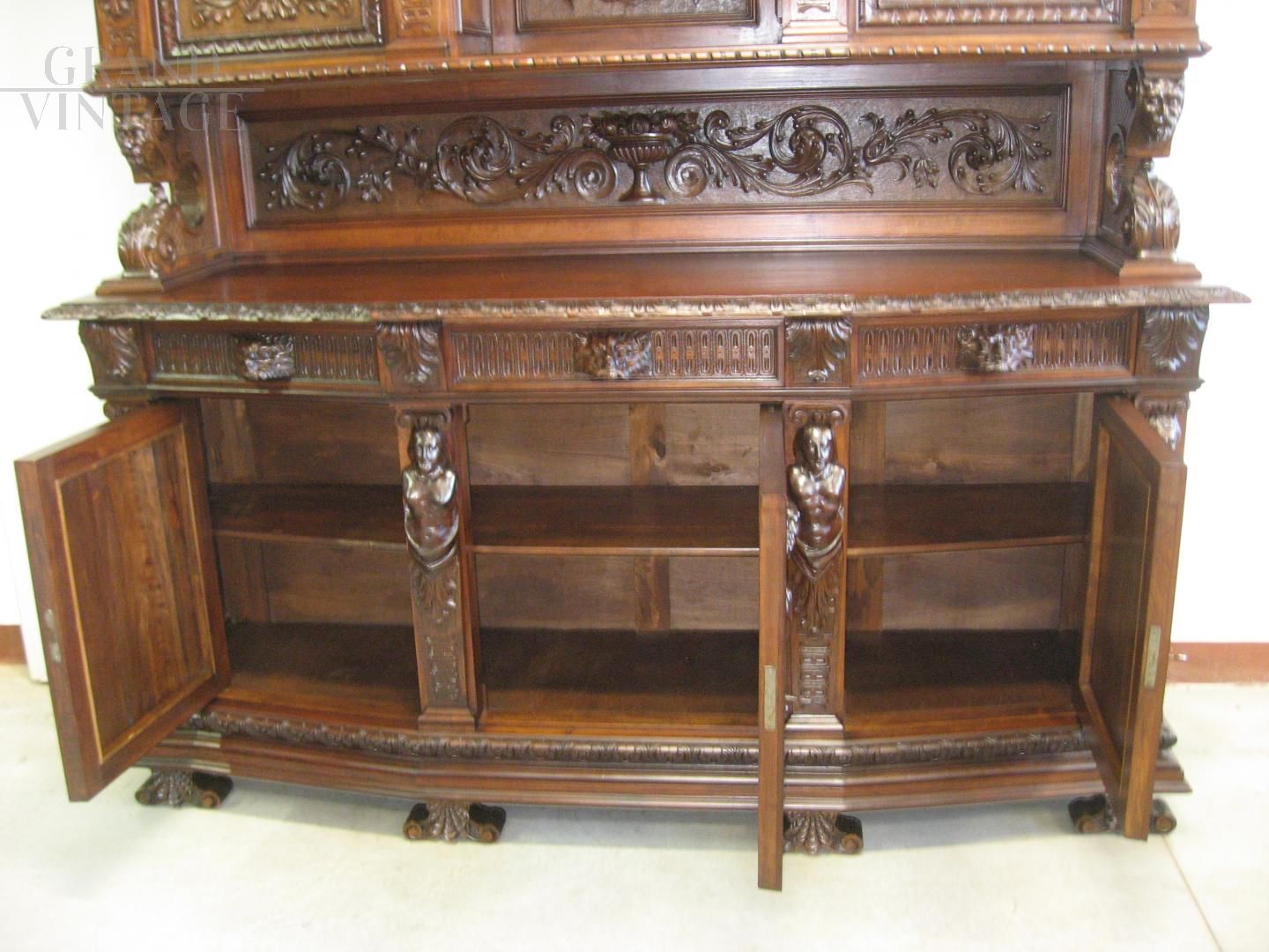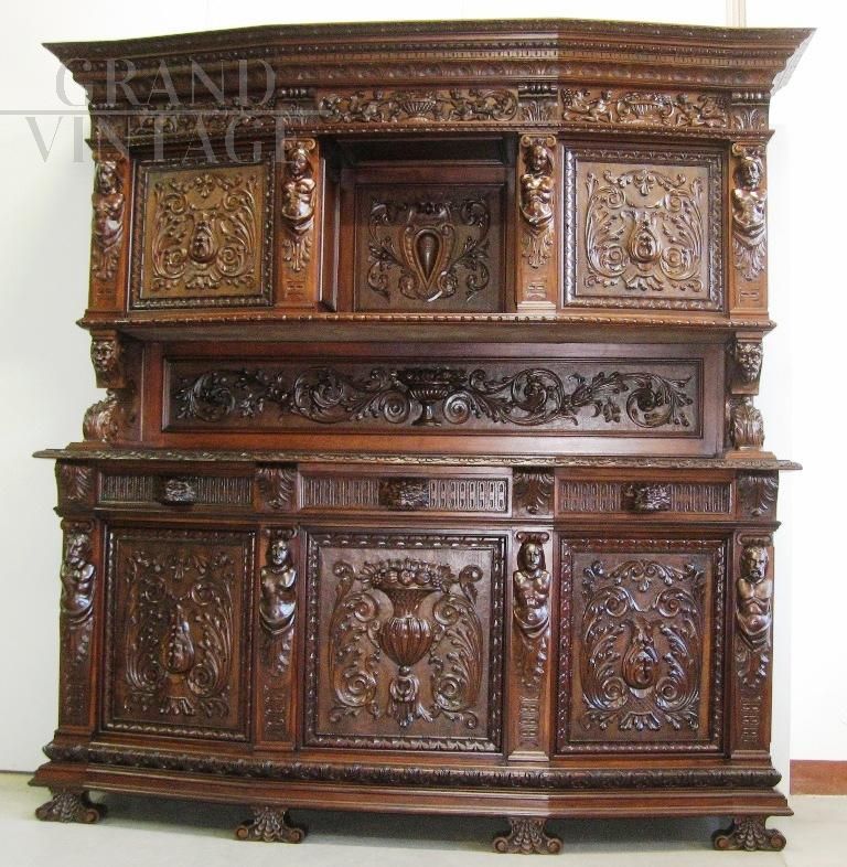 Majestic two-body sideboard in the antique style of the 17th century, made in the early 1900s. Antique Renaissance style cupbpard in walnut with solid wood parts and veneered parts, plywood bottoms and backs. Large buffet top with excellent cabinetry. Caryatids in sculpted relief, fine carvings and majestic frame.