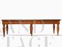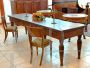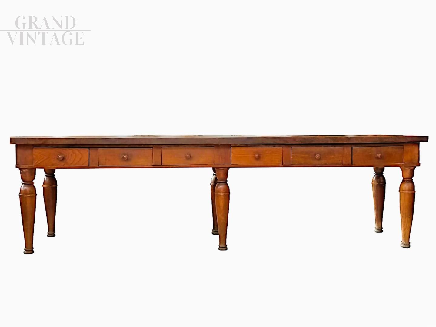 Large antique six-legged table from the early 1800s, an authentic piece of Bolognese craftsmanship. This six-legged table impresses with its high-quality workmanship. Made of solid solid elm wood, it stands out for its exceptionally thick top of 4 cm, which adds sturdiness and character. Equipped with six functional drawers and elegantly turned legs in a tapered bottle style, it skilfully recalls the classic charm of the early nineteenth century. The balanced proportion of the rectangle gives the table a discreet elegance and a slender silhouette, while maintaining a solid and imposing structure. Versatile and refined, it can be used as a large desk, kitchen work table, console or dining table.