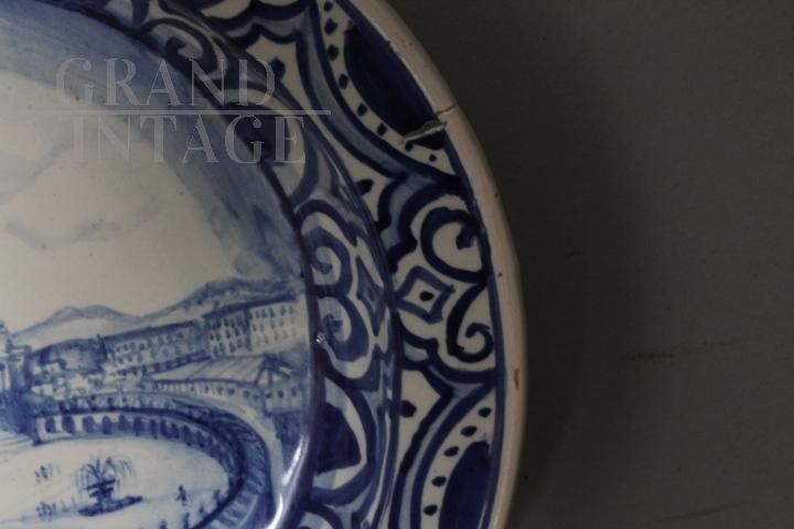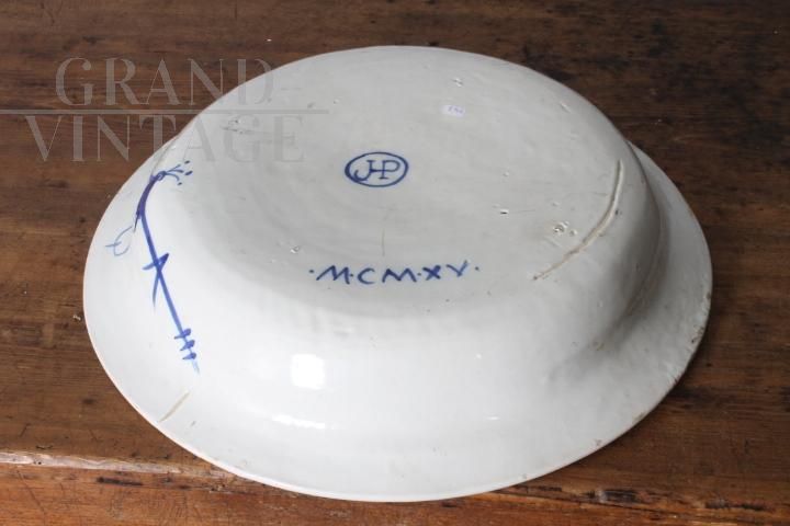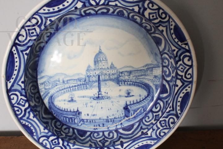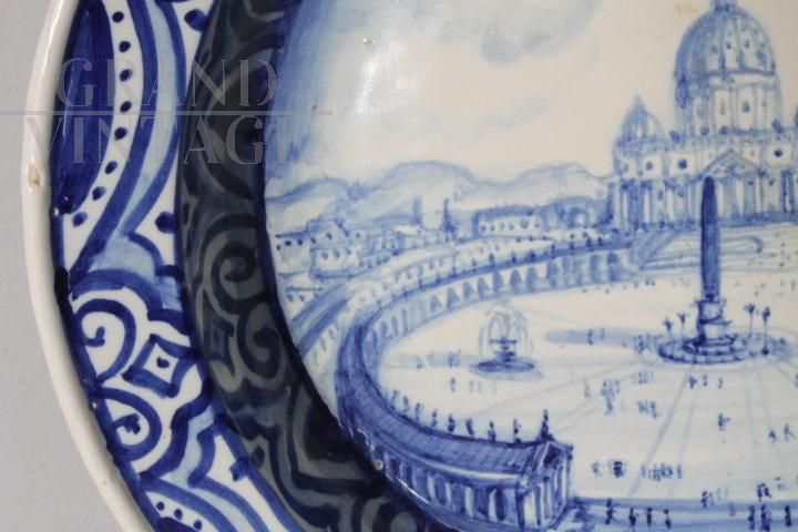 Large antique art deco majolica plate from 1915 depicting Rome - St. Peter's Square, painted in blue on a white background, of French manufacture, signed and dated on the back. Diameter 45 cm.