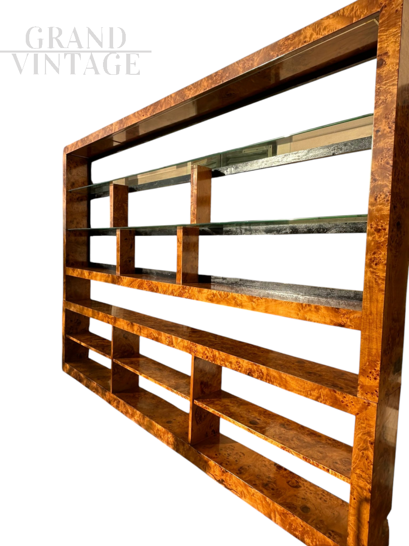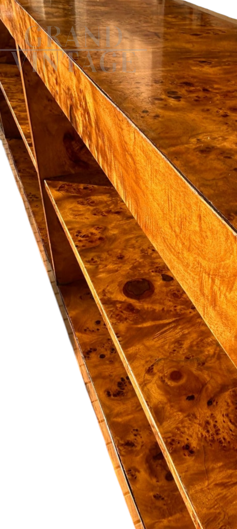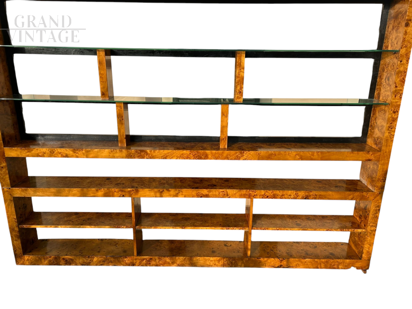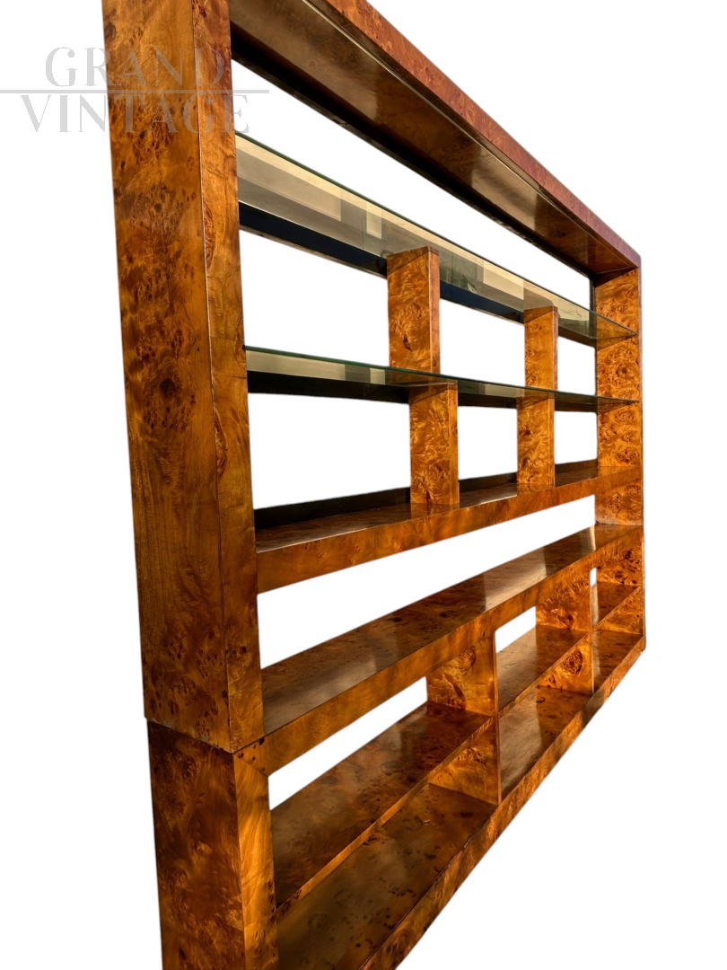 Large Art Deco open bookcase in birch briar, a rare piece of furniture to cover your walls. The bookcase is double-bodied.