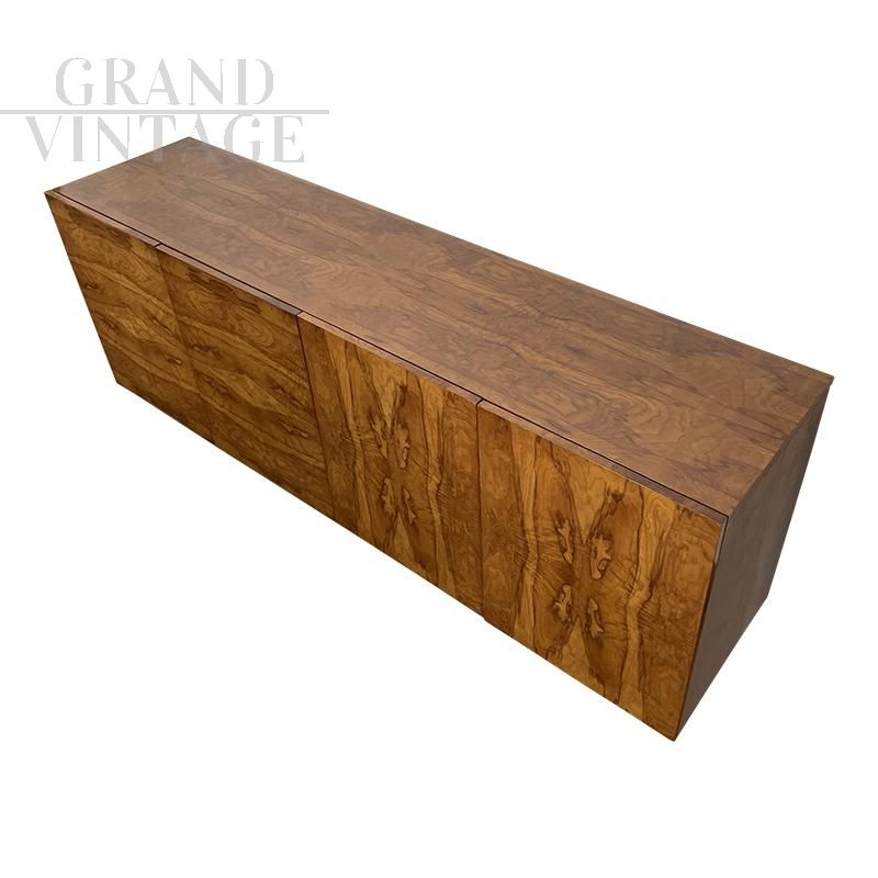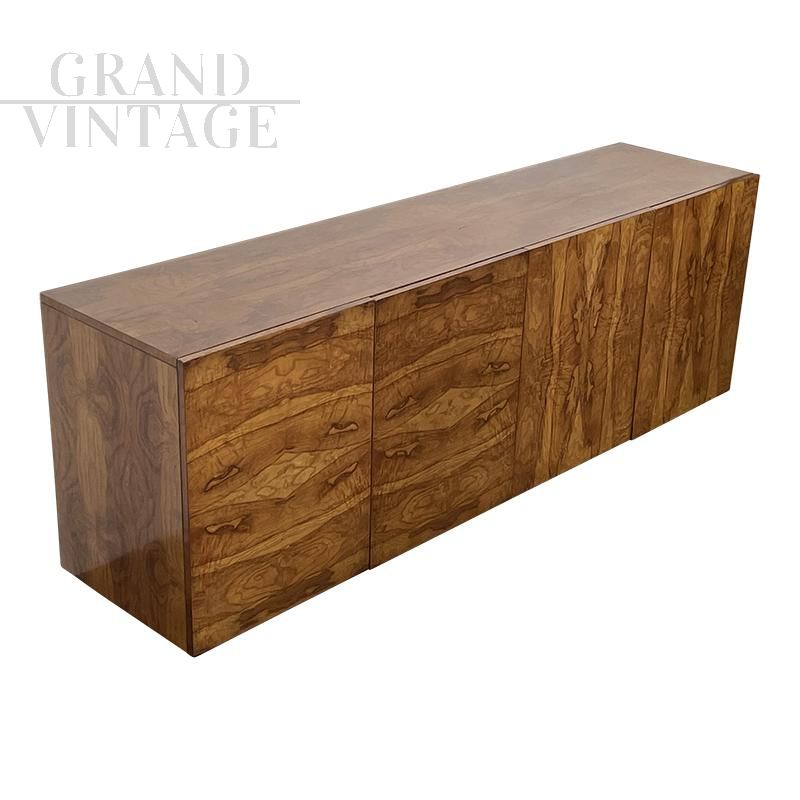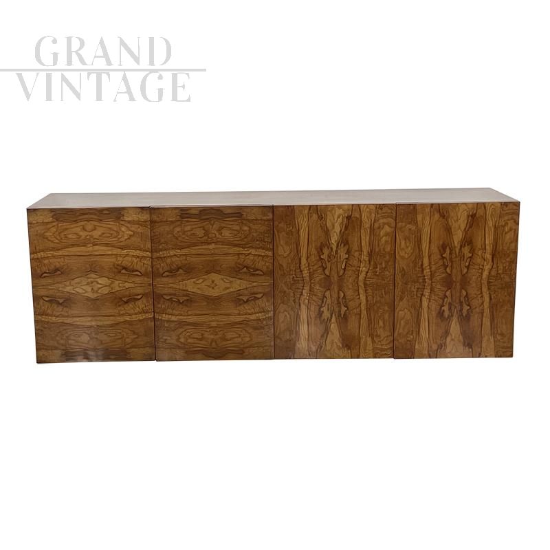 Large art deco style sideboard in briarwood with 4 push-pull doors, two internal compartments each with 5 drawers.