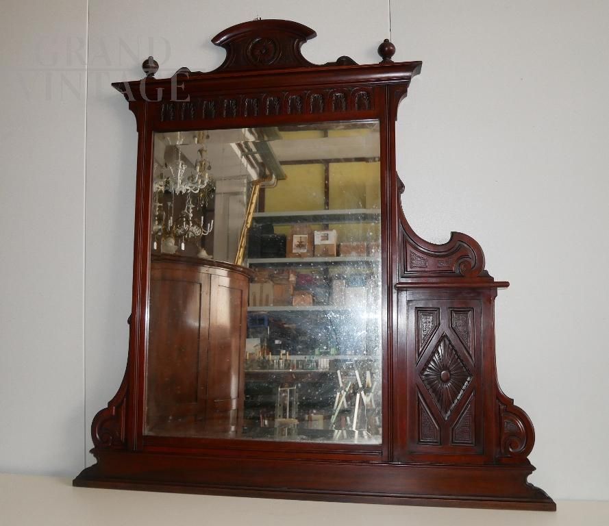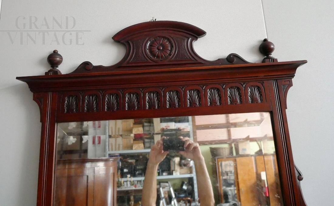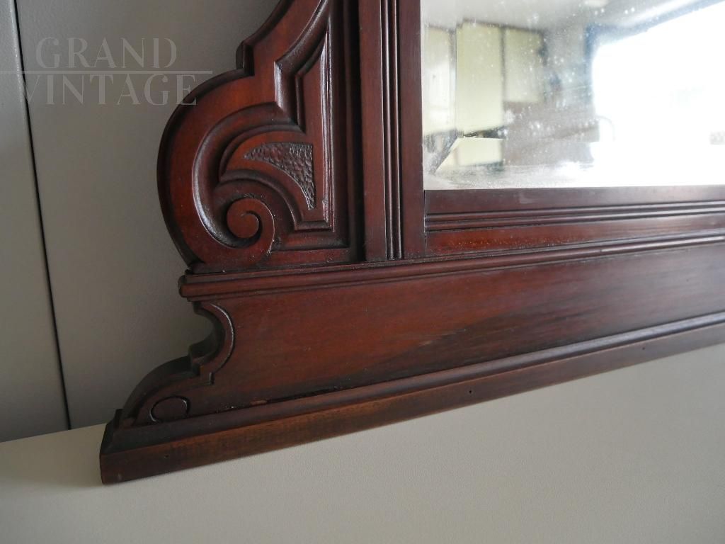 Large antique Art Nouveau Liberty mirror from the 1920s - 1930s with carved wooden frame and beveled mirror. The fruitwood frame has parts in solid wood, carved parts and veneered parts, and has a beautiful cymatium in the upper part. Excellent general condition, in dark patina.