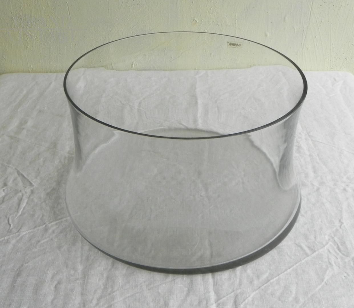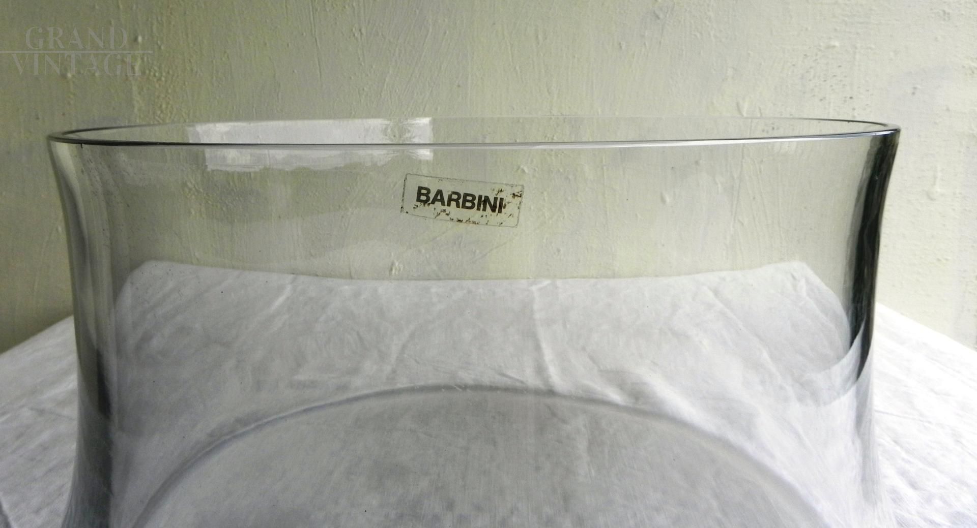 Large centerpiece bowl designed by Barbini in Murano glass from the 1970s, with large diameter and made of heavy glass, shaped in shape and thinned on the sides, with original brand sticker. Production Barbini, Murano, Venice.