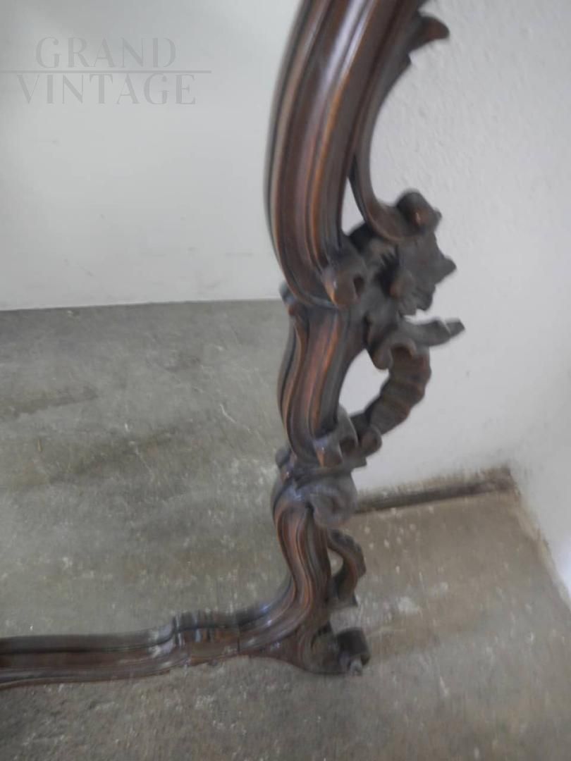 Baroque style mirror in brown painted lime wood, finely carved with curls and scrolls, complete with hooks for hanging. The back is covered with fabric with a floral pattern. In good condition, the price includes a wooden crate package.