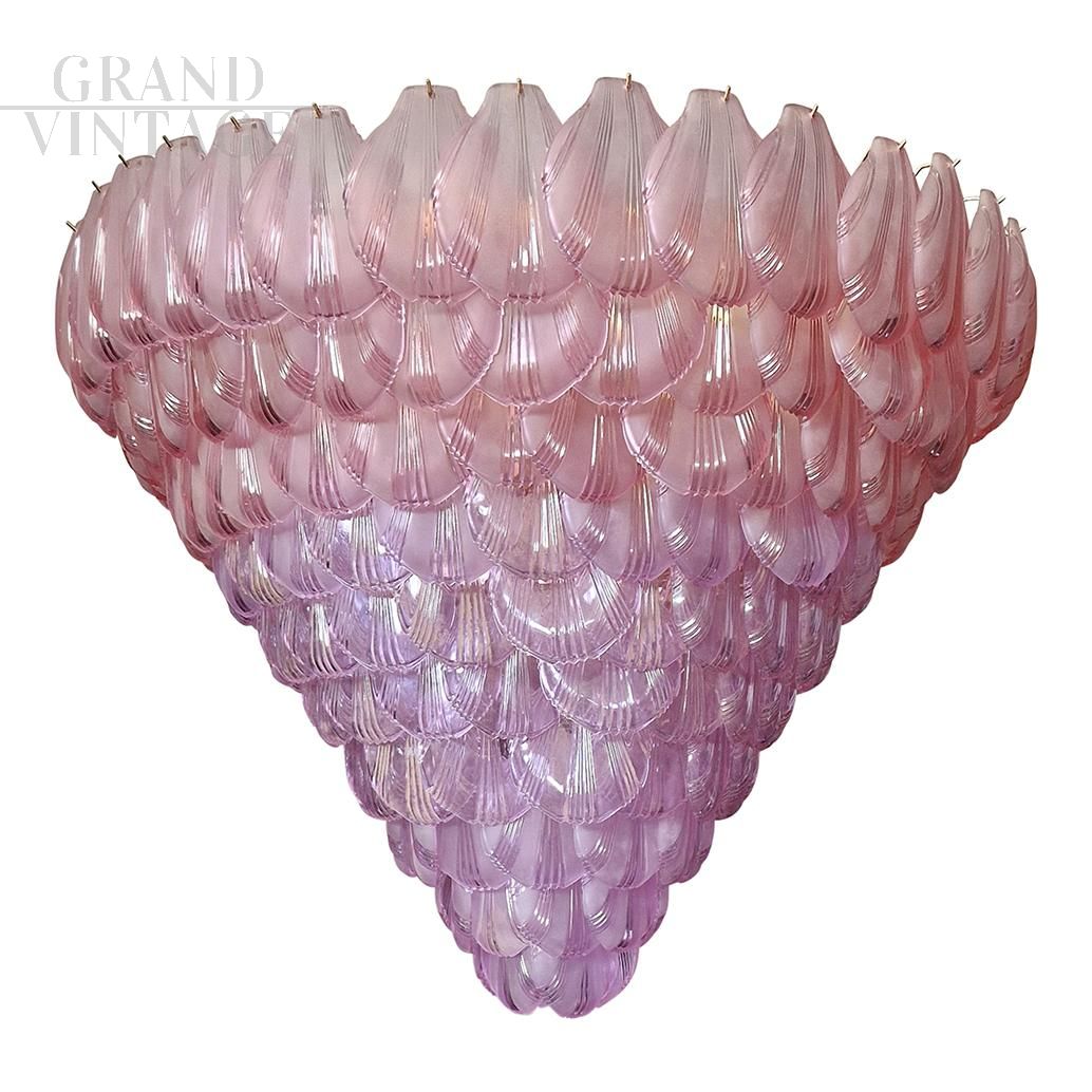 Splendid large chandelier with shells in artistic Murano glass in amber shaded lilac, Italy, 1950s. The brass structure holds 204 magnificent Murano glass shells.