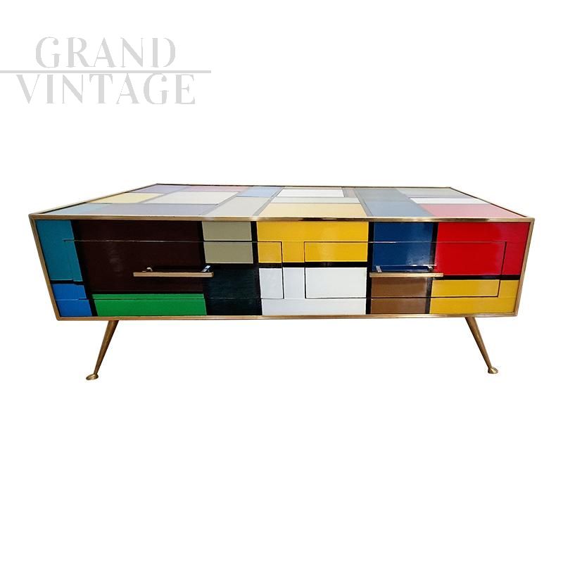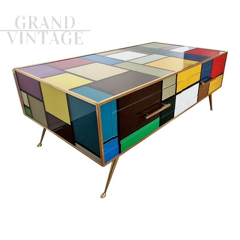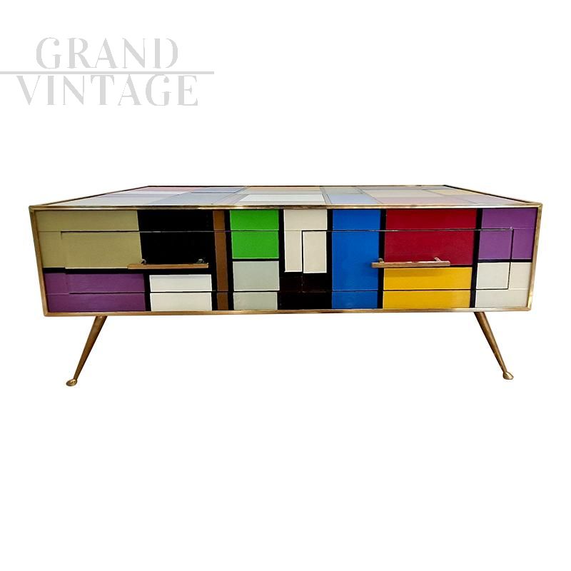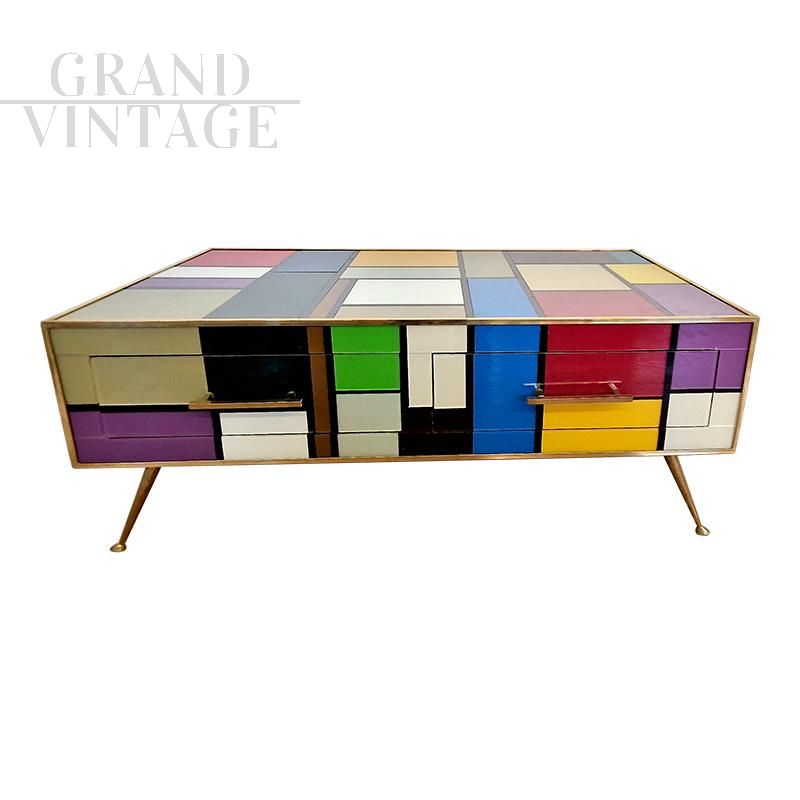 Low double-sided living room table, entirely handmade, with a base made of geometric tubular elements with a rectangular section and chrome-gold finish, top covered with glass elements of different colours, Mondrian style, equipped with two drawers on two sides.