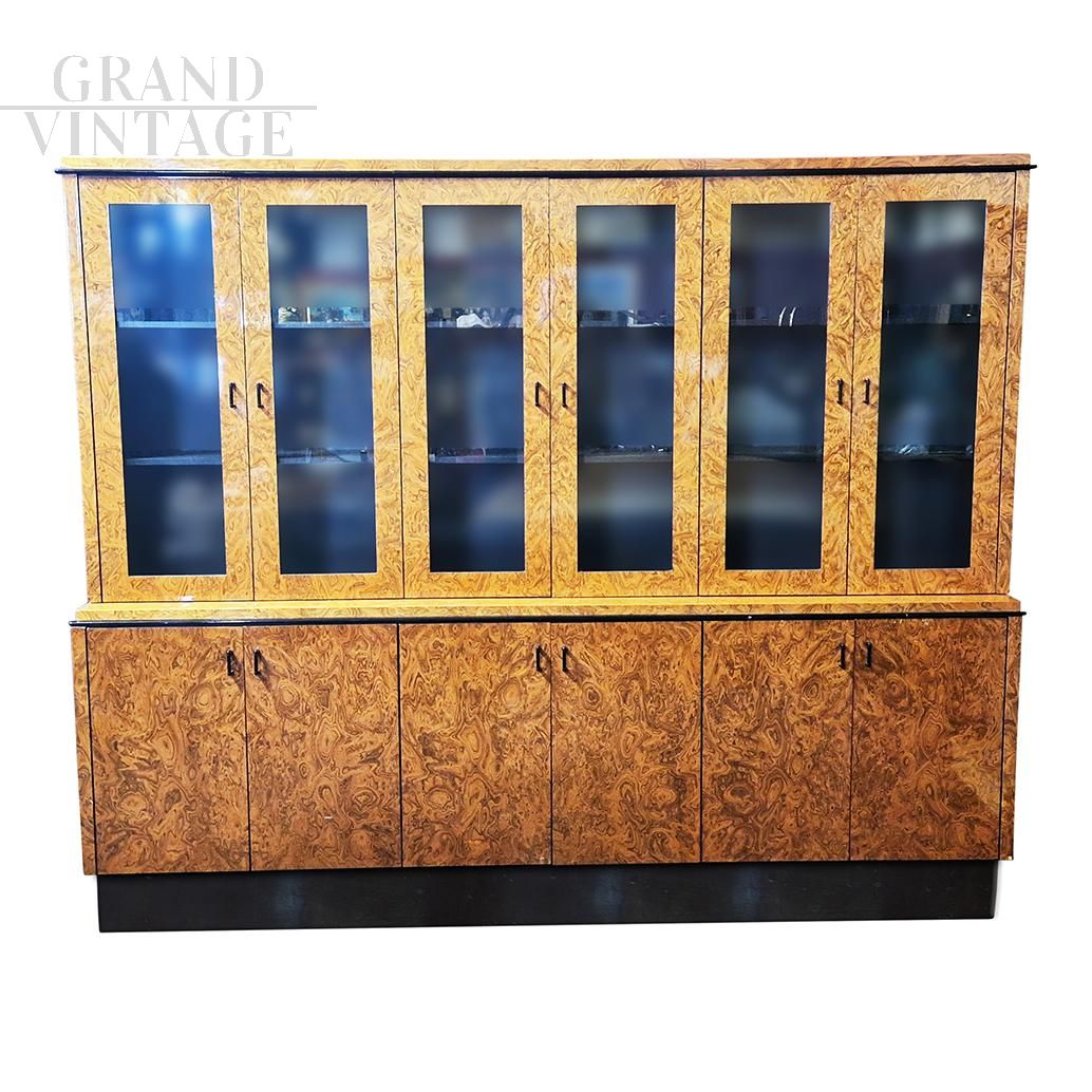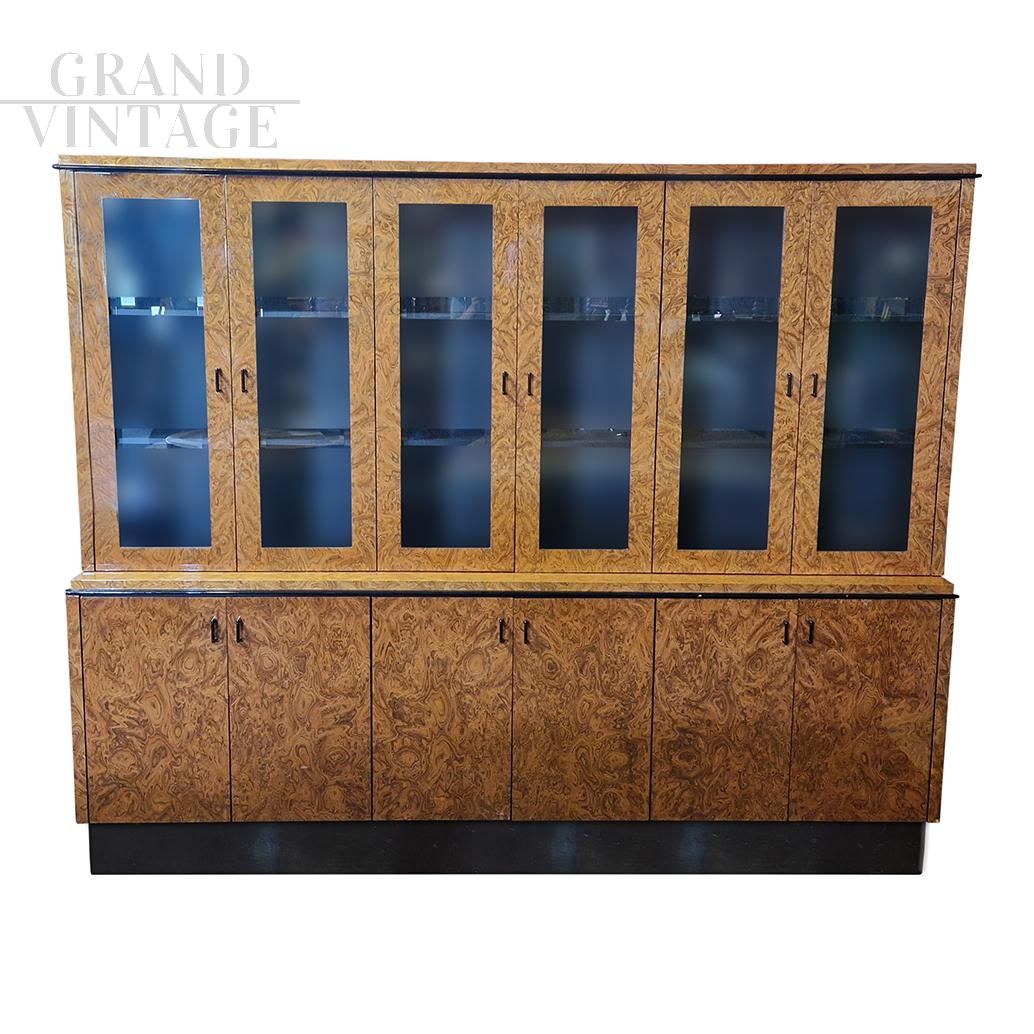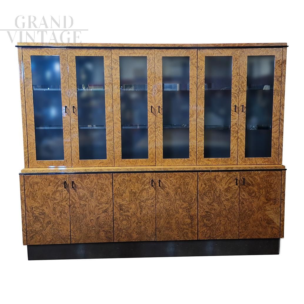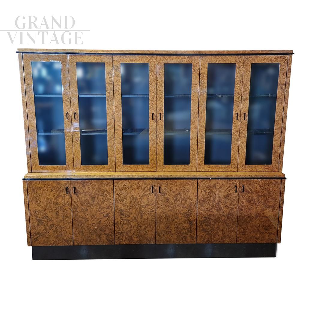 Splendid large double-body art deco bookcase finished in thuja briar, with the upper part characterized by glass display doors, made in the mid-20th century. The cabinet has three compartments in the lower part with six hinged doors and three compartments in the upper part with six glass doors and internal shelves. The furniture rests on a black lacquered plinth.