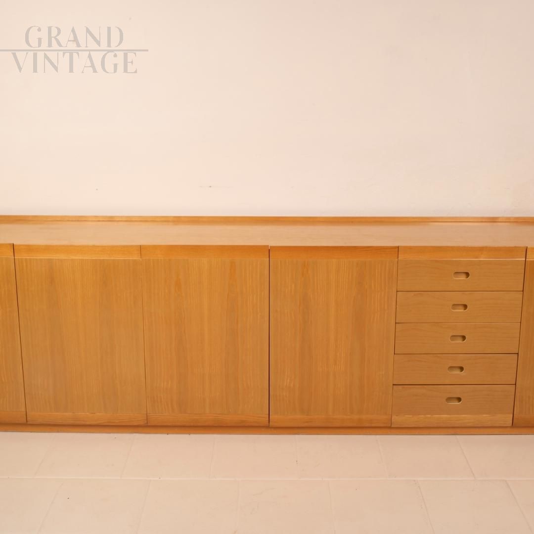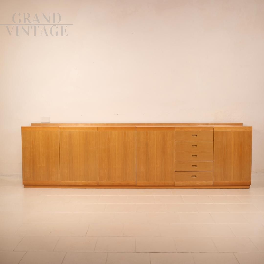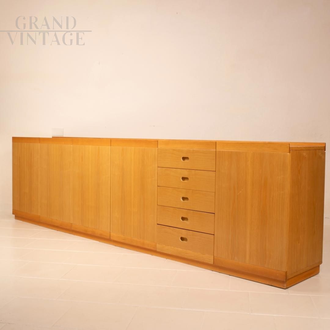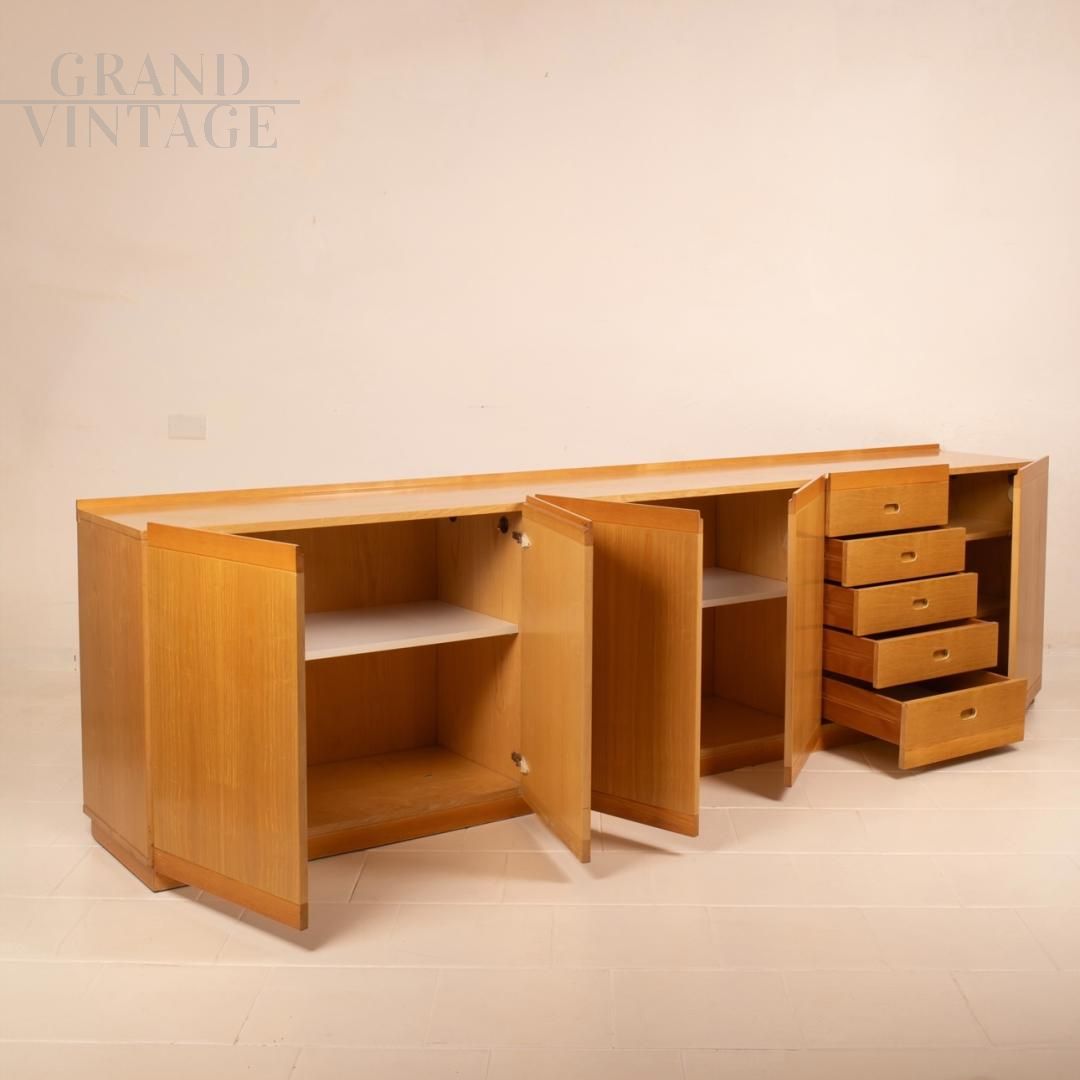 Rare large sideboard belonging to the "Fiorenza" series designed by Tito Agnoli for Molteni in the late 1960s, one of the most renowned brands for high-quality design in the Italian furniture sector. This is a piece of furniture made of light wood, solid ash and feather, with a linear and clean structure that reflects the modern and functional style typical of mid-20th century Italian design. The sideboard is long and low, ideal for living areas or design offices, and is made up of several compartments closed by doors and a series of central drawers with recessed handles, which guarantee practicality without altering the minimalist aesthetic. Bibliography: Domus November 1970 P.42