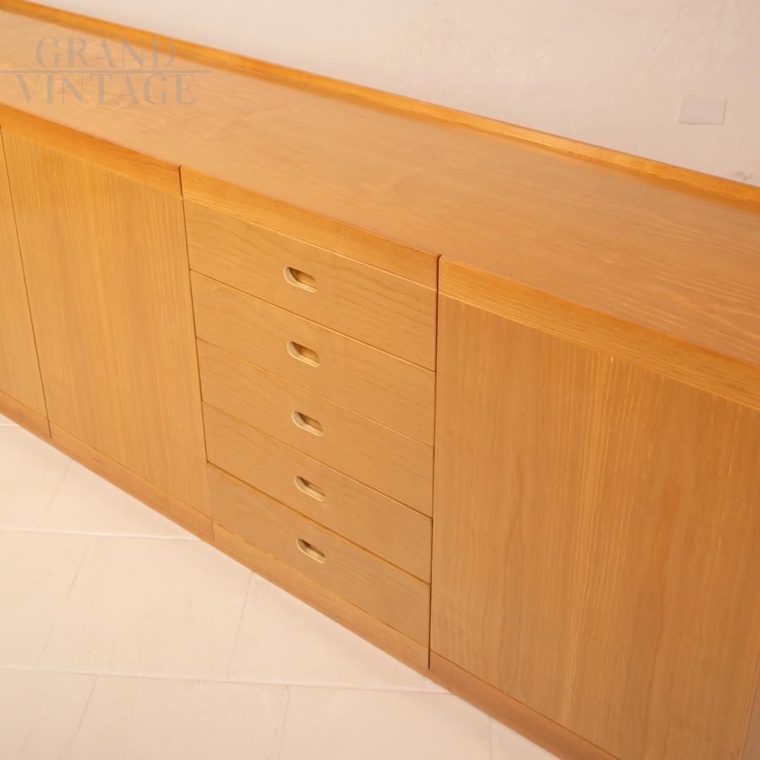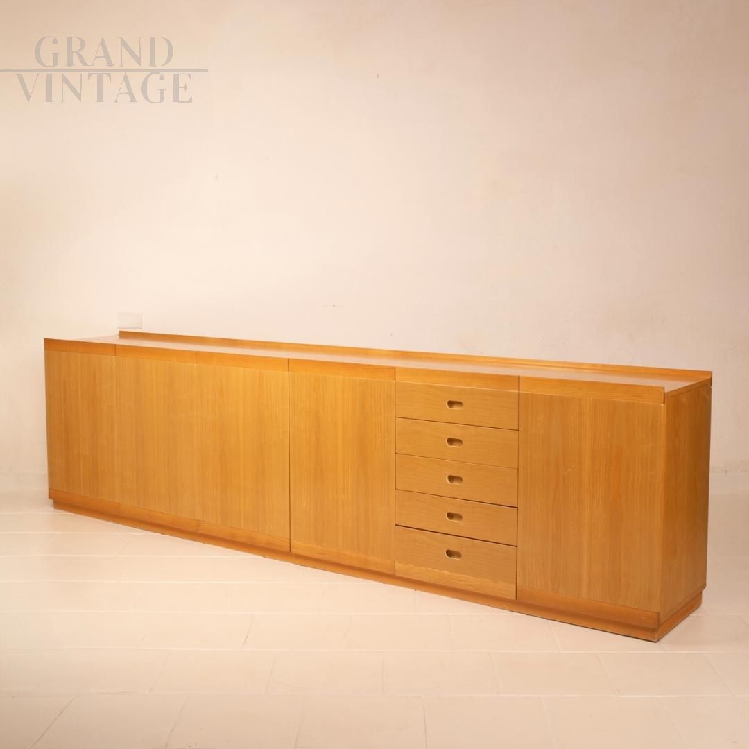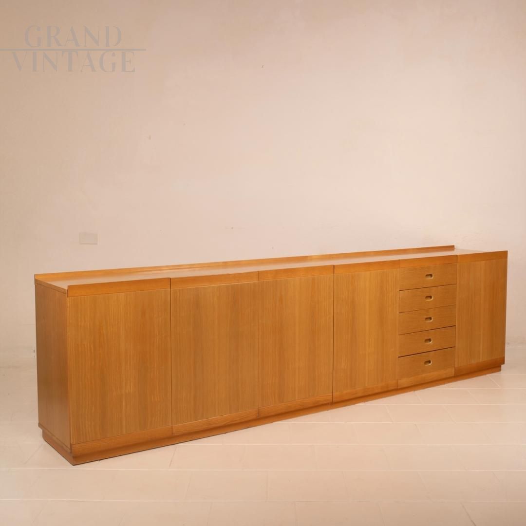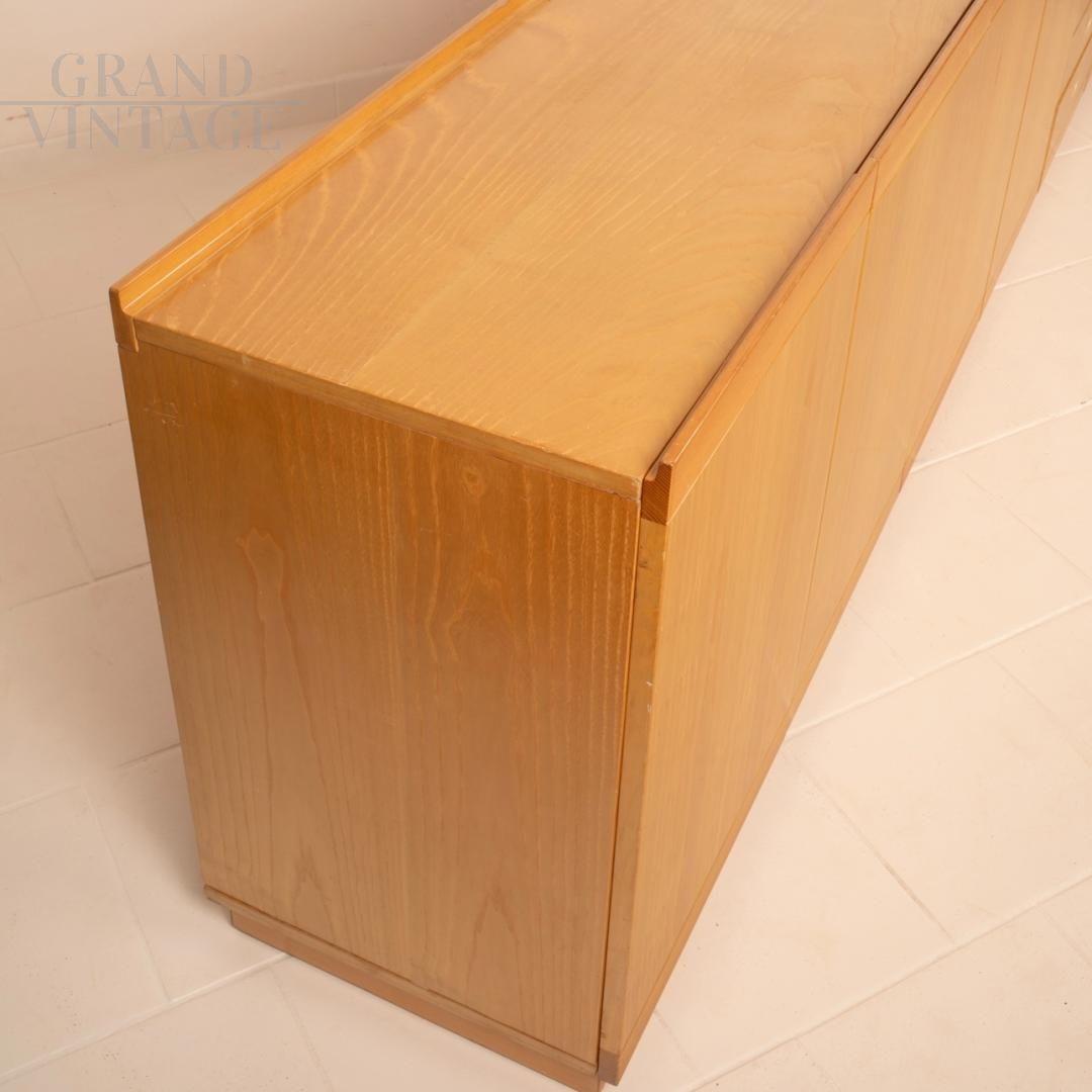Rare large sideboard belonging to the "Fiorenza" series designed by Tito Agnoli for Molteni in the late 1960s, one of the most renowned brands for high-quality design in the Italian furniture sector. This is a piece of furniture made of light wood, solid ash and feather, with a linear and clean structure that reflects the modern and functional style typical of mid-20th century Italian design. The sideboard is long and low, ideal for living areas or design offices, and is made up of several compartments closed by doors and a series of central drawers with recessed handles, which guarantee practicality without altering the minimalist aesthetic. Bibliography: Domus November 1970 P.42