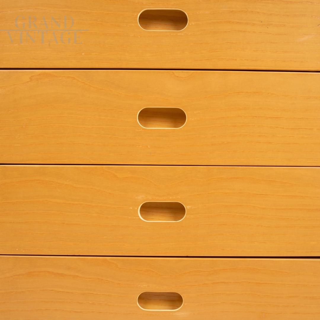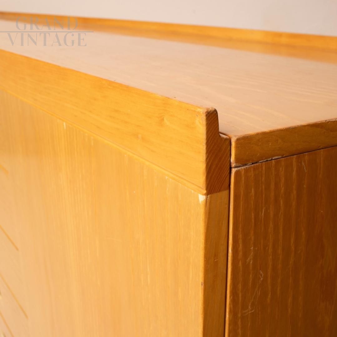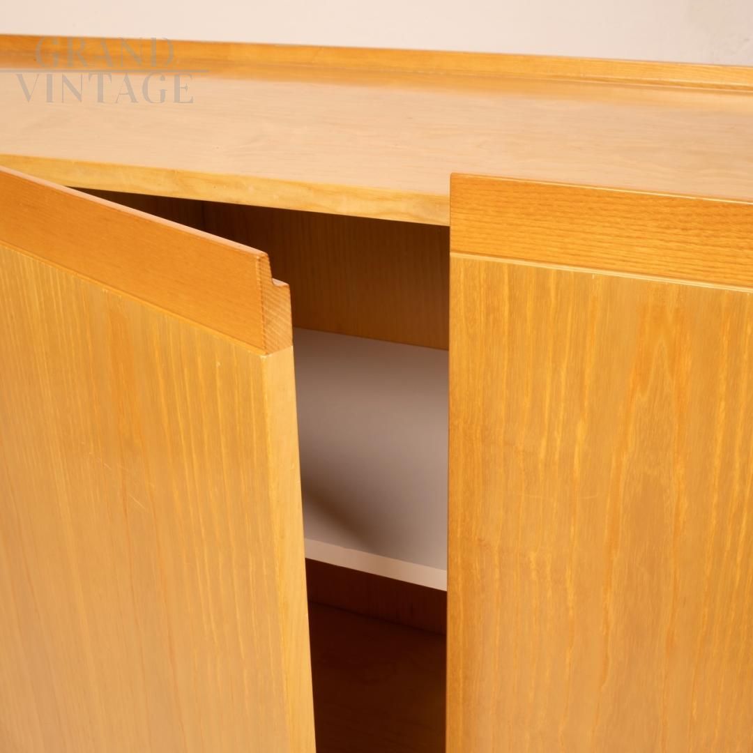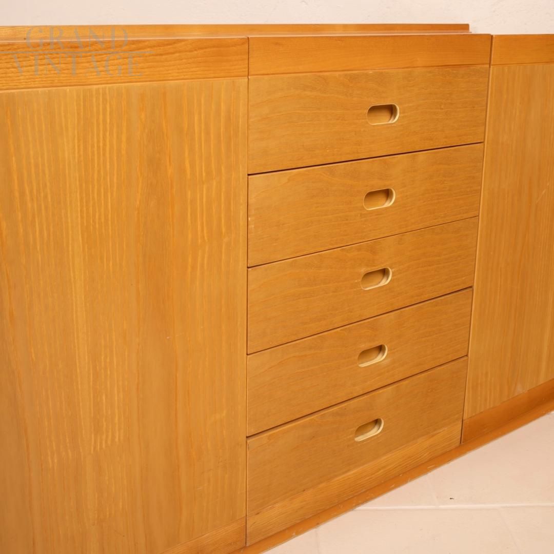 Rare large sideboard belonging to the "Fiorenza" series designed by Tito Agnoli for Molteni in the late 1960s, one of the most renowned brands for high-quality design in the Italian furniture sector. This is a piece of furniture made of light wood, solid ash and feather, with a linear and clean structure that reflects the modern and functional style typical of mid-20th century Italian design. The sideboard is long and low, ideal for living areas or design offices, and is made up of several compartments closed by doors and a series of central drawers with recessed handles, which guarantee practicality without altering the minimalist aesthetic. Bibliography: Domus November 1970 P.42