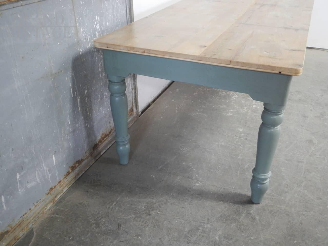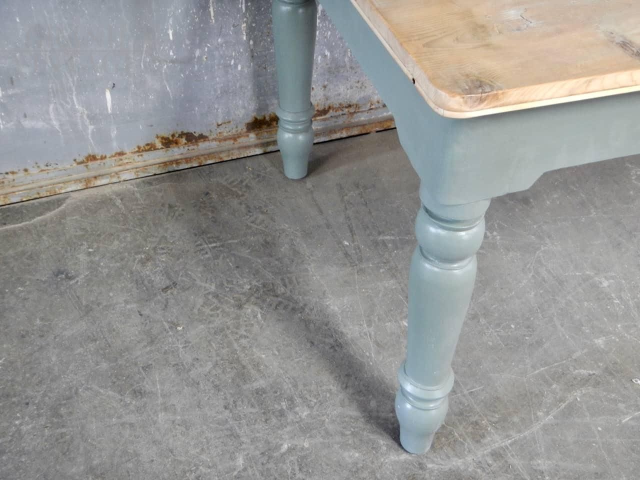 Large vintage fir table in green - gray paint with beautiful turned legs, equipped with 3 newly rebuilt drawers and a natural fir top in patina.