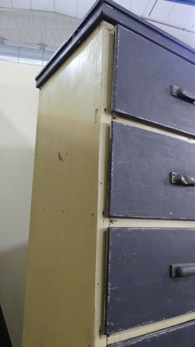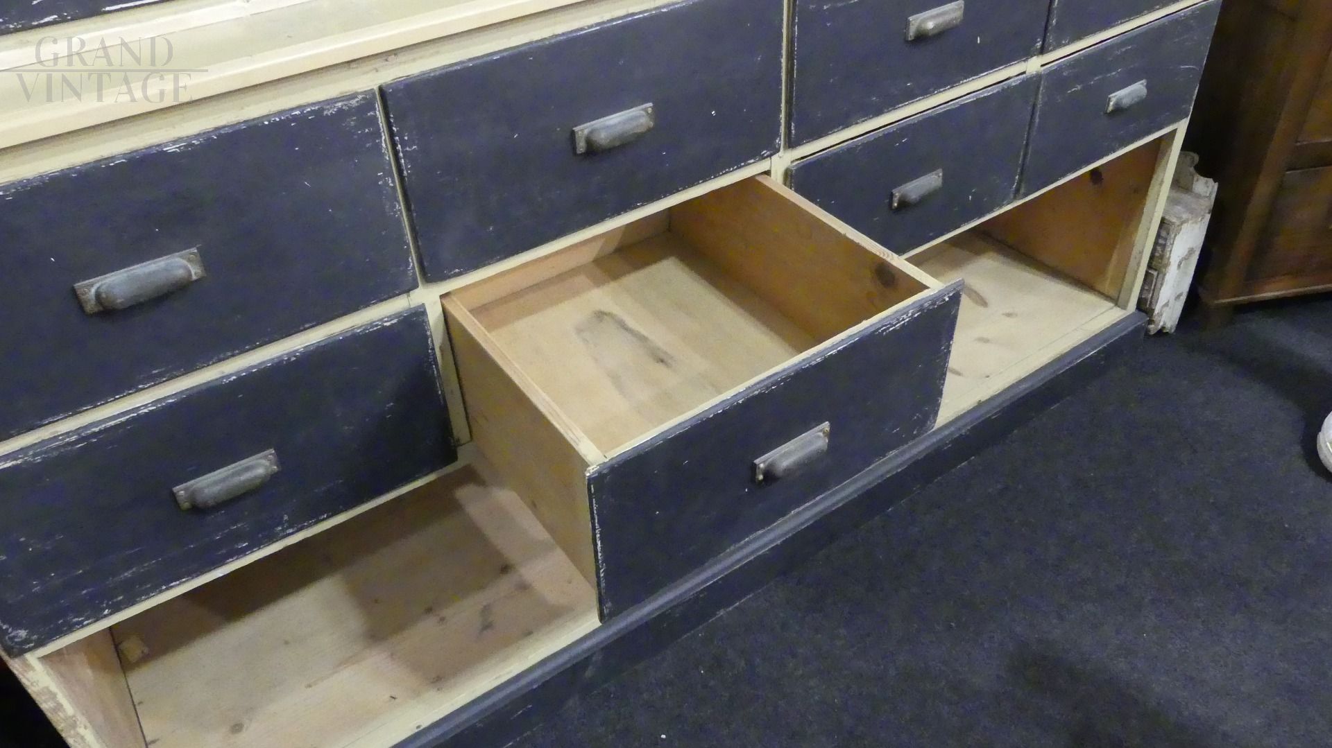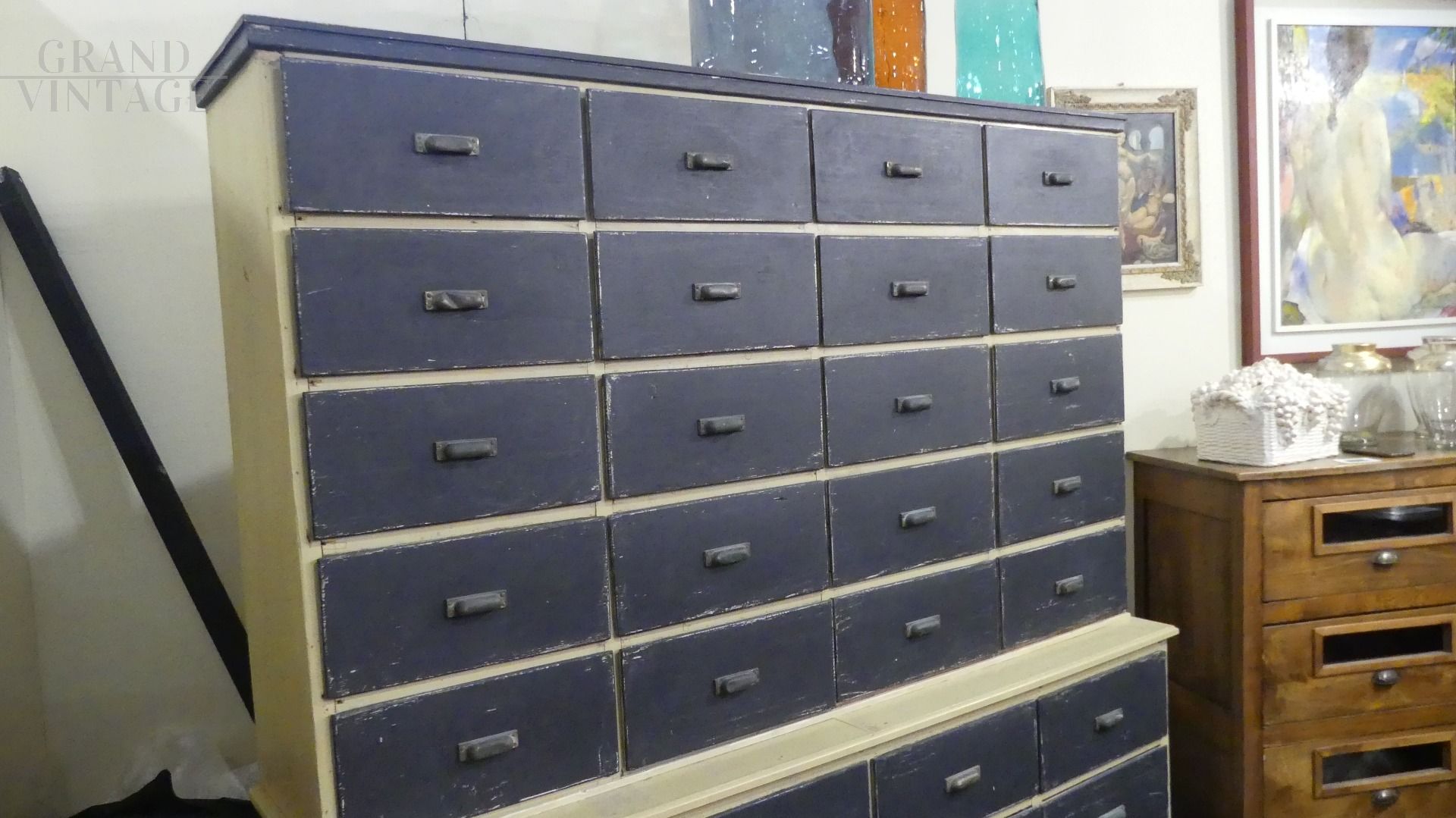The cabinet holds a wall, and is arranged in two parts, the upper part with 20 drawers and the lower part with 8 drawers and a large compartment to collect bulky goods, such as rolls of fabric.