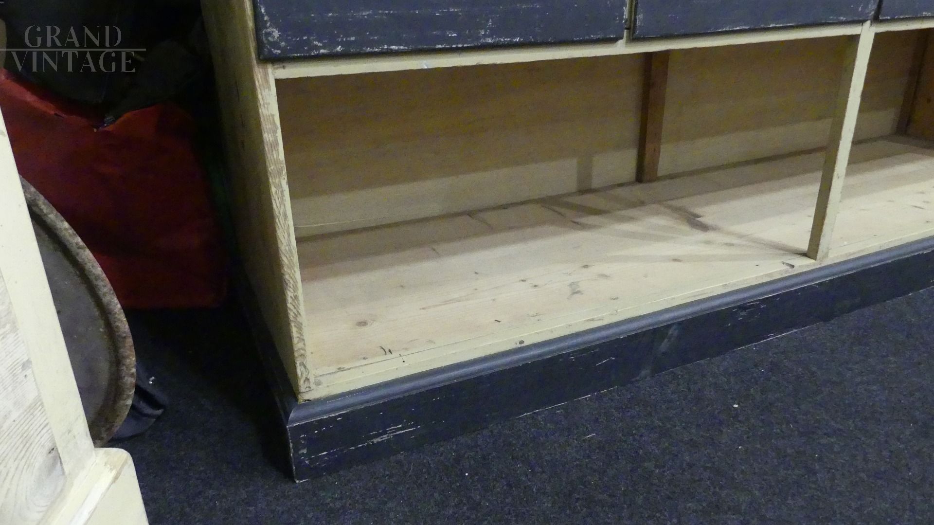 Large vintage industrial wall unit for haberdashery in beige lacquered pine wood with black lacquered drawers.