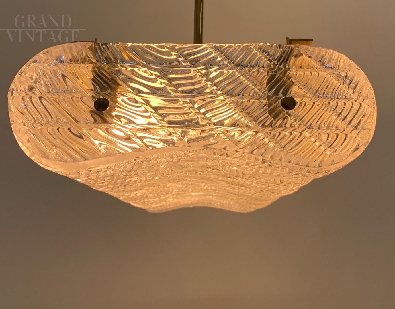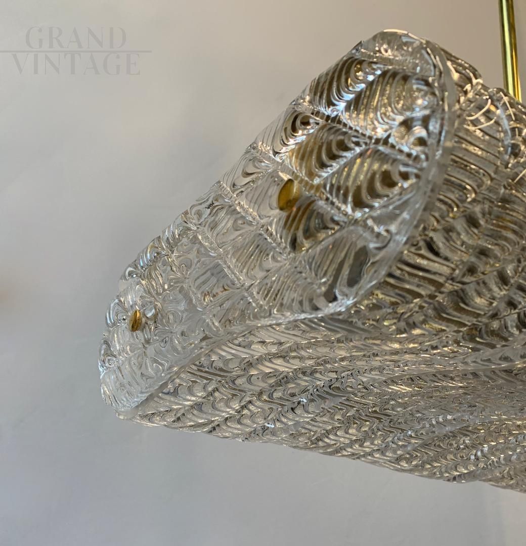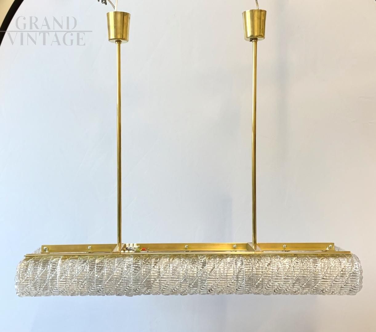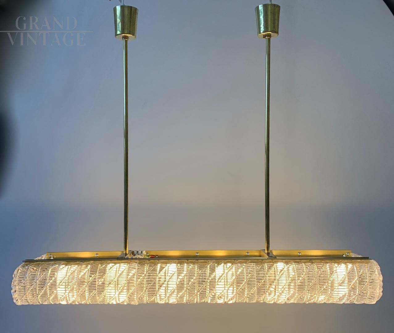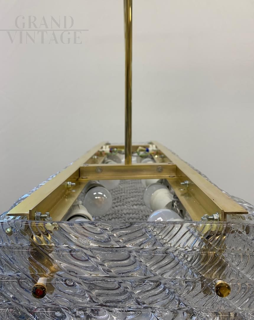 Fantastic and rare horizontal chandelier in finely crafted Murano glass on a golden brass structure, made in recent times respecting the high standards of design and quality of materials, it can be customized in size, making it longer or shorter. The chandelier is entirely original made in Italy, with fantastic transparent crystal-colored glass made in Murano and a brass structure with 1950s cups, and is composed of several glass modules. It is a rare and very particular and important piece, this model has 12 light points with connections for E27 type ceramic bulbs, on request the electrical system can also be made for America. Supporting structure of the chandelier in brass and threads in iron interior.