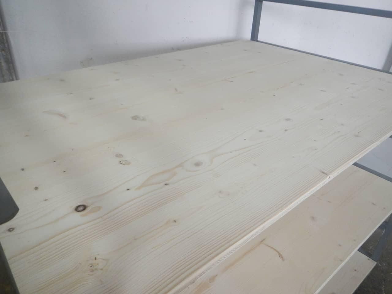 Industrial trolley with shelves used in ceramic factories, finished with fir blockboard shelves. Cleaned and treated with iron and wood wax. In good condition.
