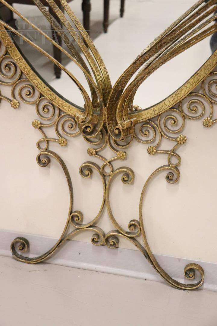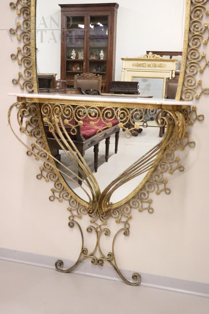 Stunning oval floor mirror, an exquisite piece of mid-century Italian design, attributed to designer Pier Luigi Colli. This majestic mirror features a beautifully gilded wrought iron frame, with an eye-catching wavy decoration adorned with curls and spirals that follow one another elegantly in a harmonious design, interspersed with delicate floral motifs. The gilding enhances the intricate design, creating a perfect balance between opulence and understated elegance. This mirror is not only a visual element of great impact, but it is also a functional console table, complete with a refined light marble top with pale pink veins. In excellent condition, price negotiable.