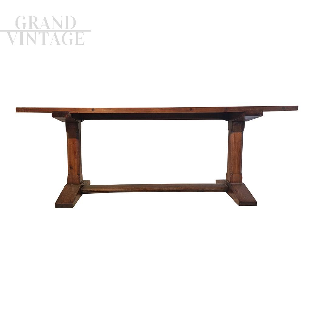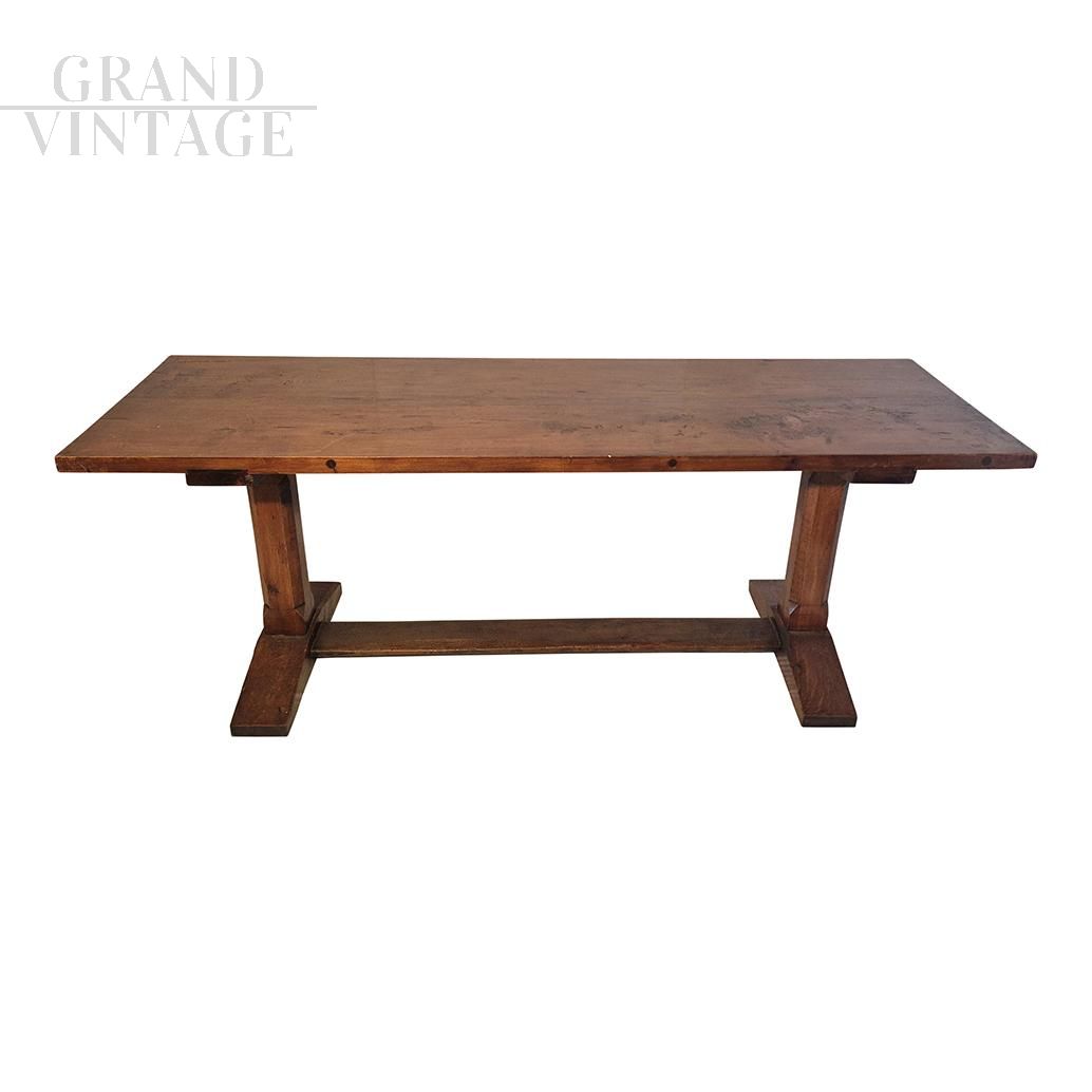 Large rectangular table of Italian production dating back to the 1970s made of solid walnut wood following the historic Fratino style. Its very solid structure underlines its quality and durability. Ideal for environments with a rustic character, such as taverns, or for Scandinavian style furnishings, it adds a touch of warmth and authenticity to any space.