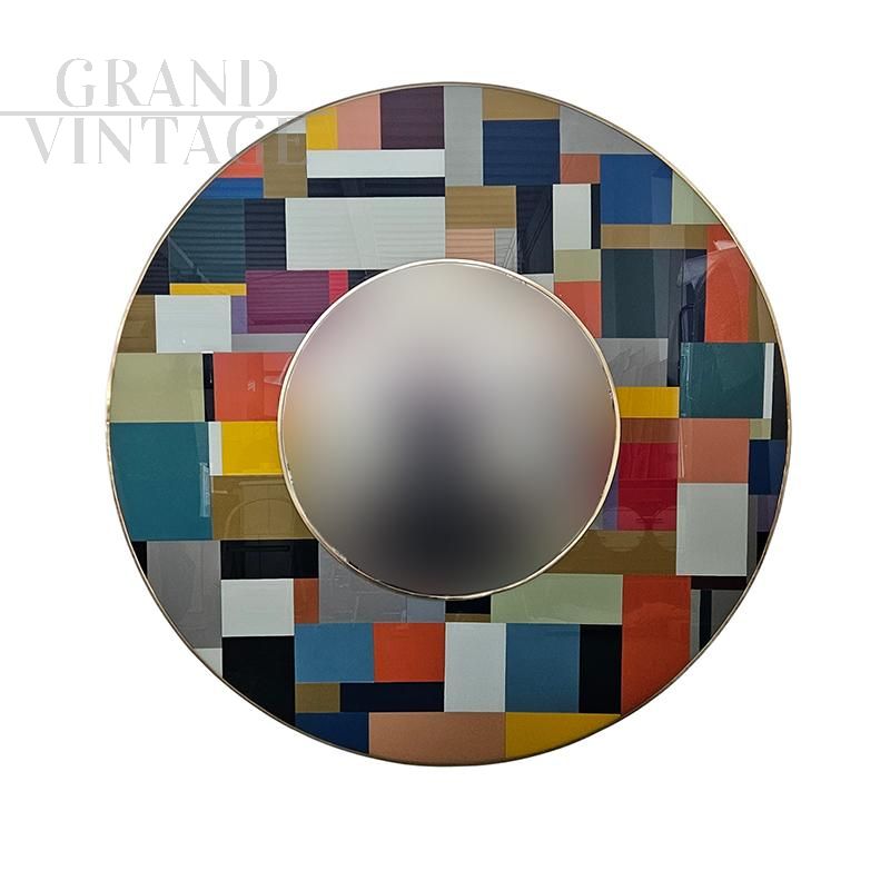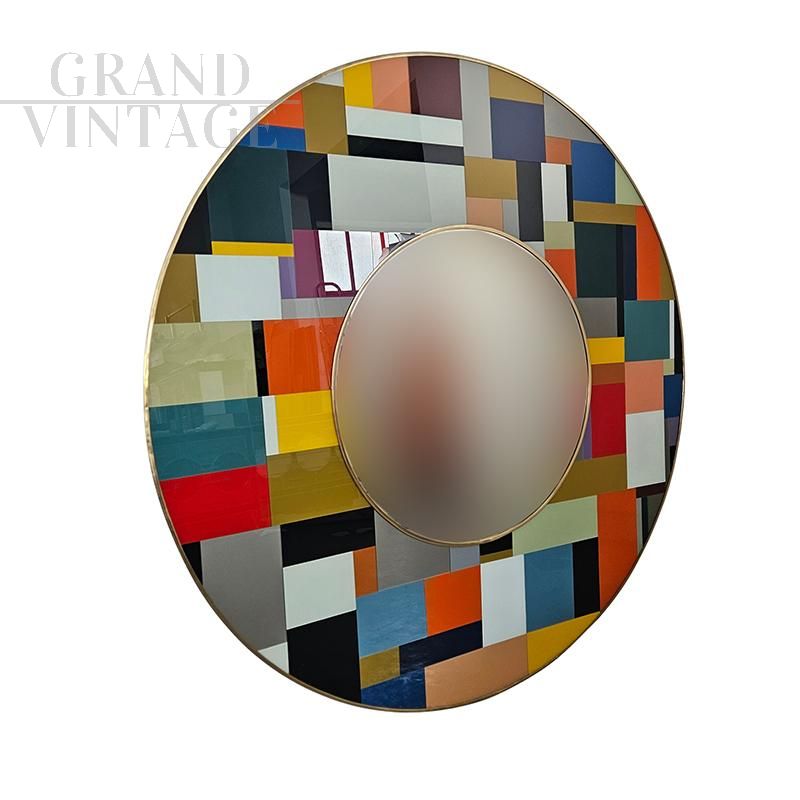 Mirror with round wooden structure, covered in glass tiles, entirely handmade, golden brass profiles.