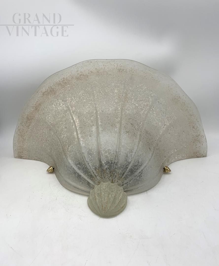 Fantastic and rare single wall light sconce by the Seguso company in very particular Murano glass, transparent with a slightly greyish sand effect, Italy 1980s. In good condition, the glass is whole and not cracked and the brass and iron supporting structure has been painted white. The lamp has 3 sockets for E27 ceramic bulbs. Few signs of aging on the structure.