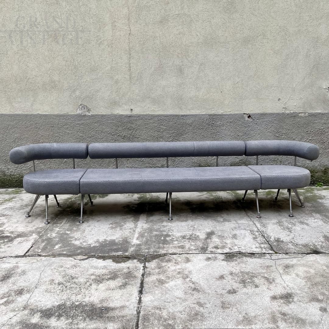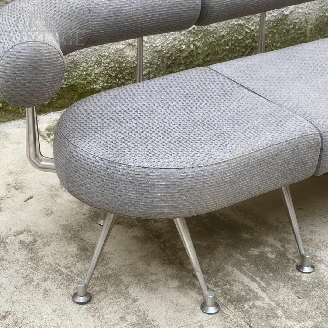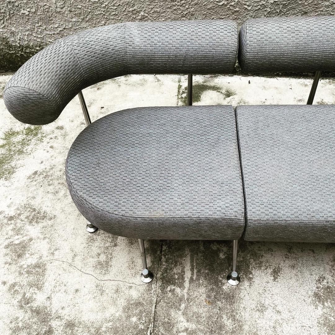 Large 80's Italian sofa composed of a straight central element and two elements on the sides with a rounded shape and curved back. Each upholstered part is removable, the feet are adjustable and the backrest is in die-cast aluminum. It has no worn parts, cuts or tears. Design inspired by great names in Italian Design.