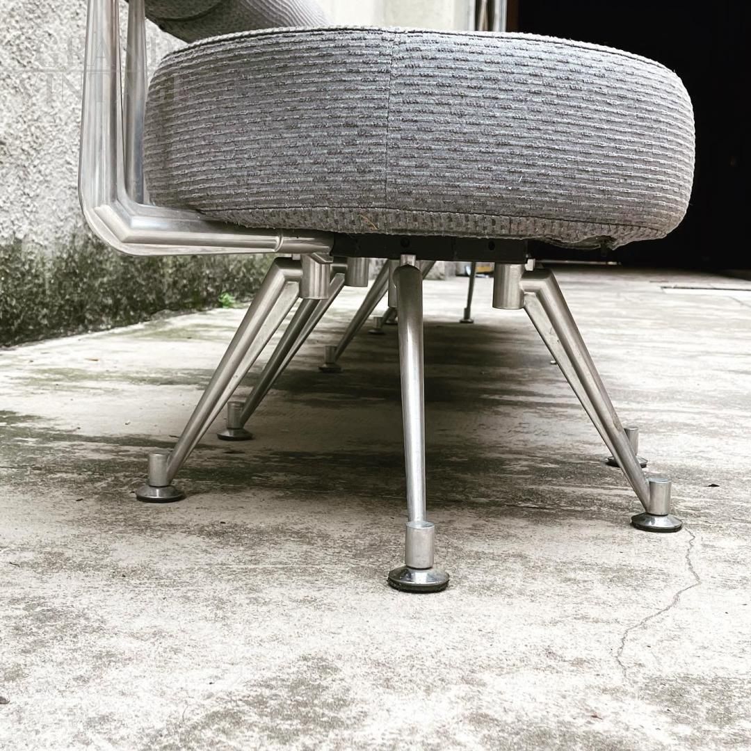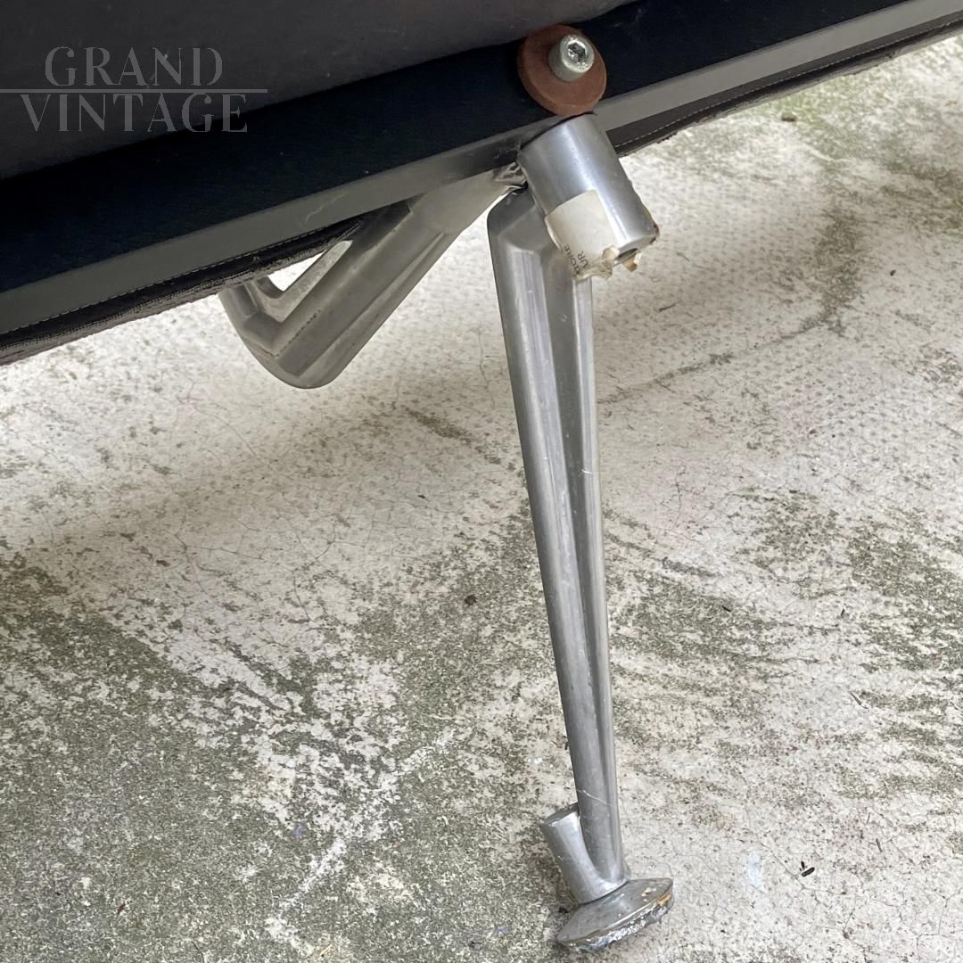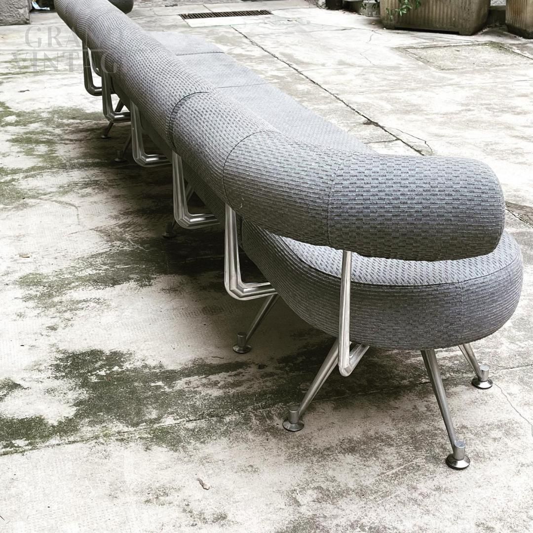 Large 80's Italian sofa composed of a straight central element and two elements on the sides with a rounded shape and curved back. Each upholstered part is removable, the feet are adjustable and the backrest is in die-cast aluminum. It has no worn parts, cuts or tears. Design inspired by great names in Italian Design.