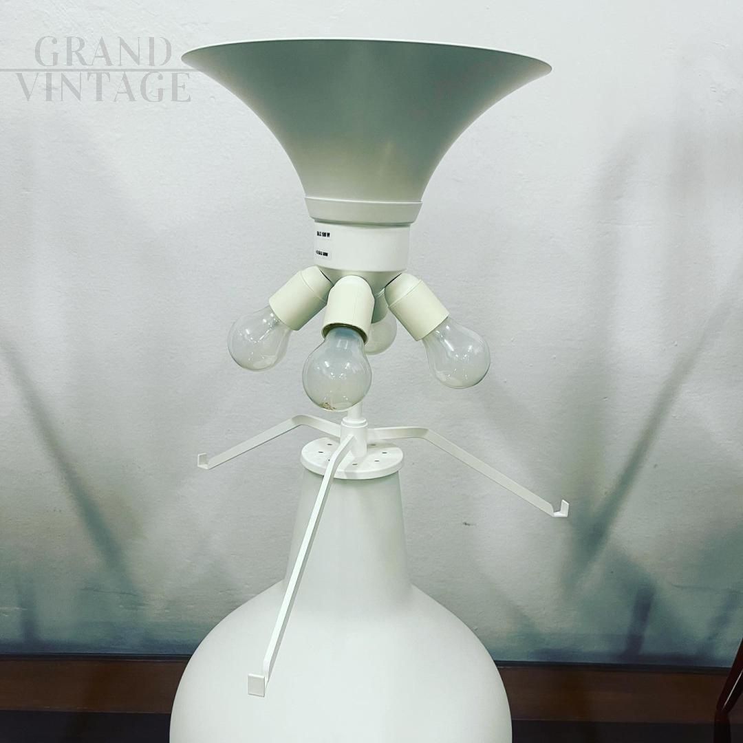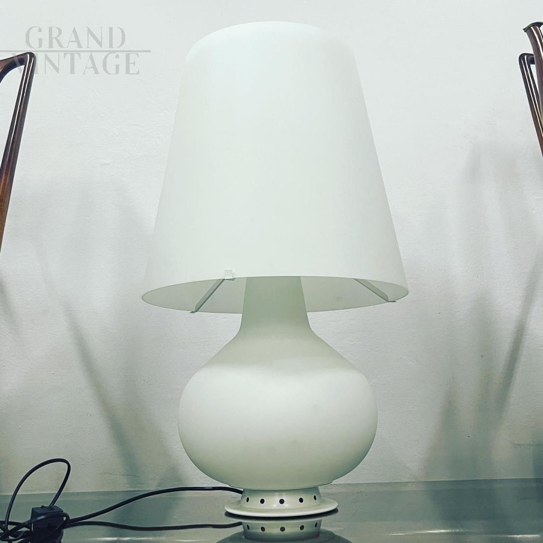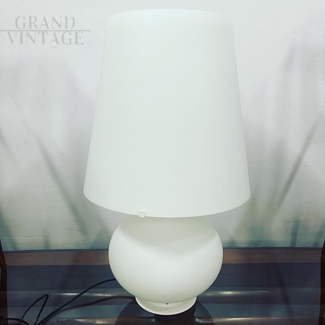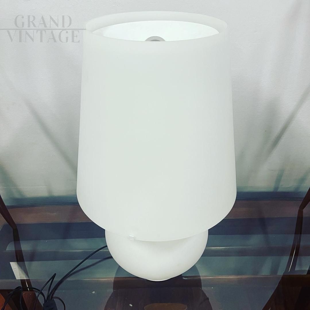 Glass lamp designed by Max Ingrand for Fontana arte, here in the larger version of 80 cm in height. The structure is in opal glass and rests on a white painted metal base. It bears the logo both on the bottom of the base and on the switch. Recently produced model.