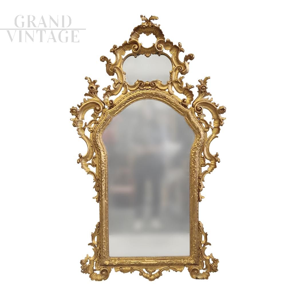 Large Venetian mirror in antique Louis XV style in carved and gilded wood, from the early 1900s; scroll decorations, leaf and floral elements, perforated cymatium centered by a mirror.