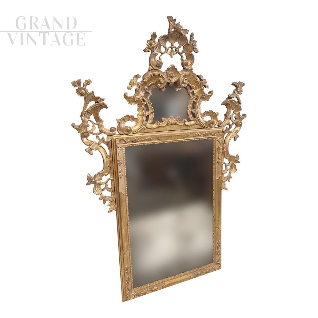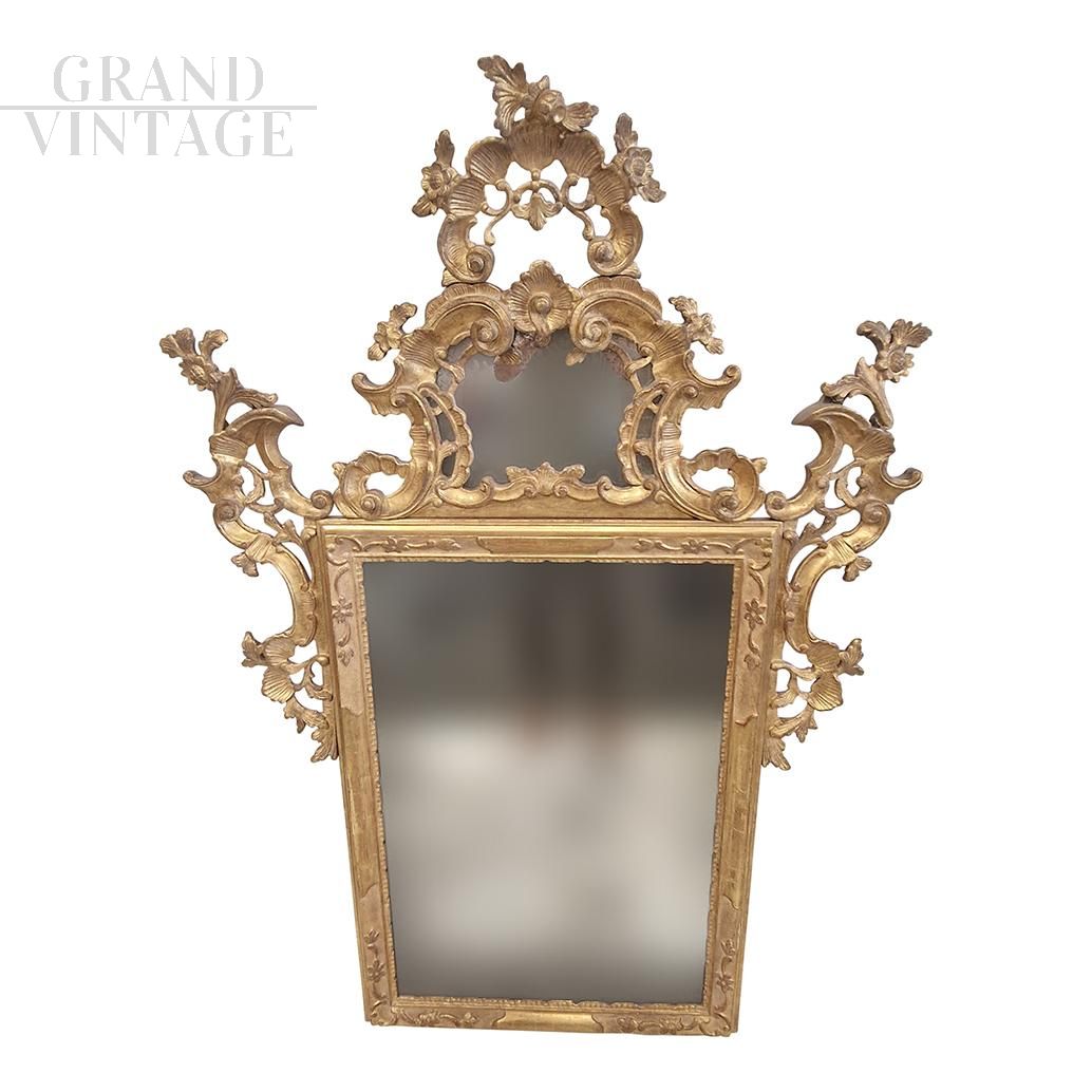 Large Venetian mirror in antique Louis XV style in carved and gilded wood, from the early 1900s, decorated with rich scrolls and leaf and floral elements, the cymatium is perforated and centered by a small mirror.