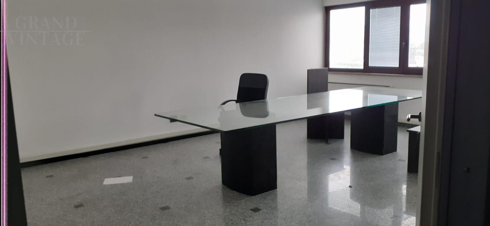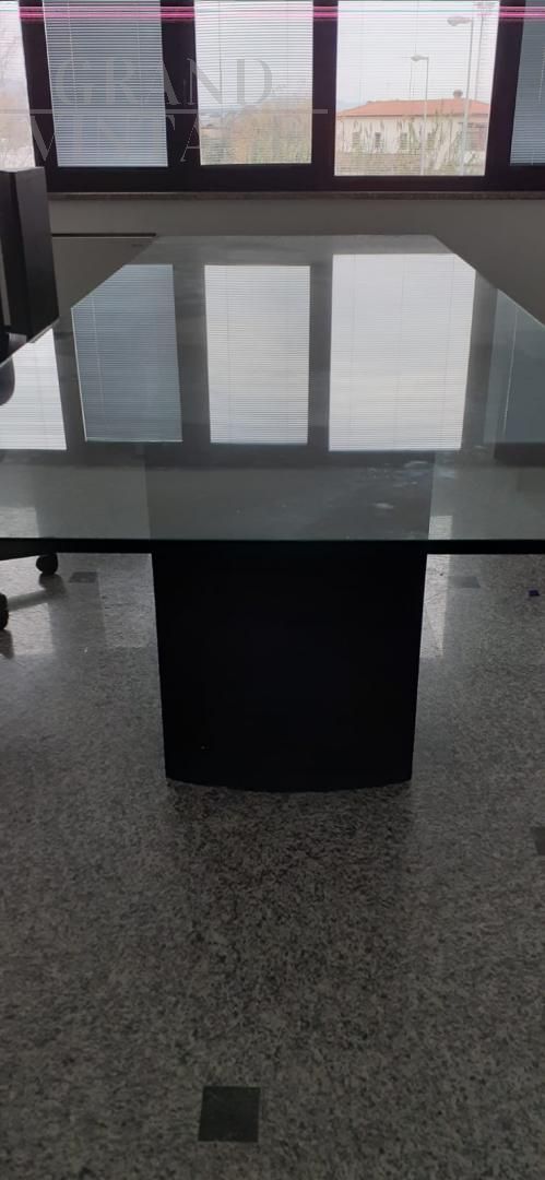 Large vintage table with 2 cm thick glass top and wooden feet, used for meeting rooms but also perfect as a living room table.