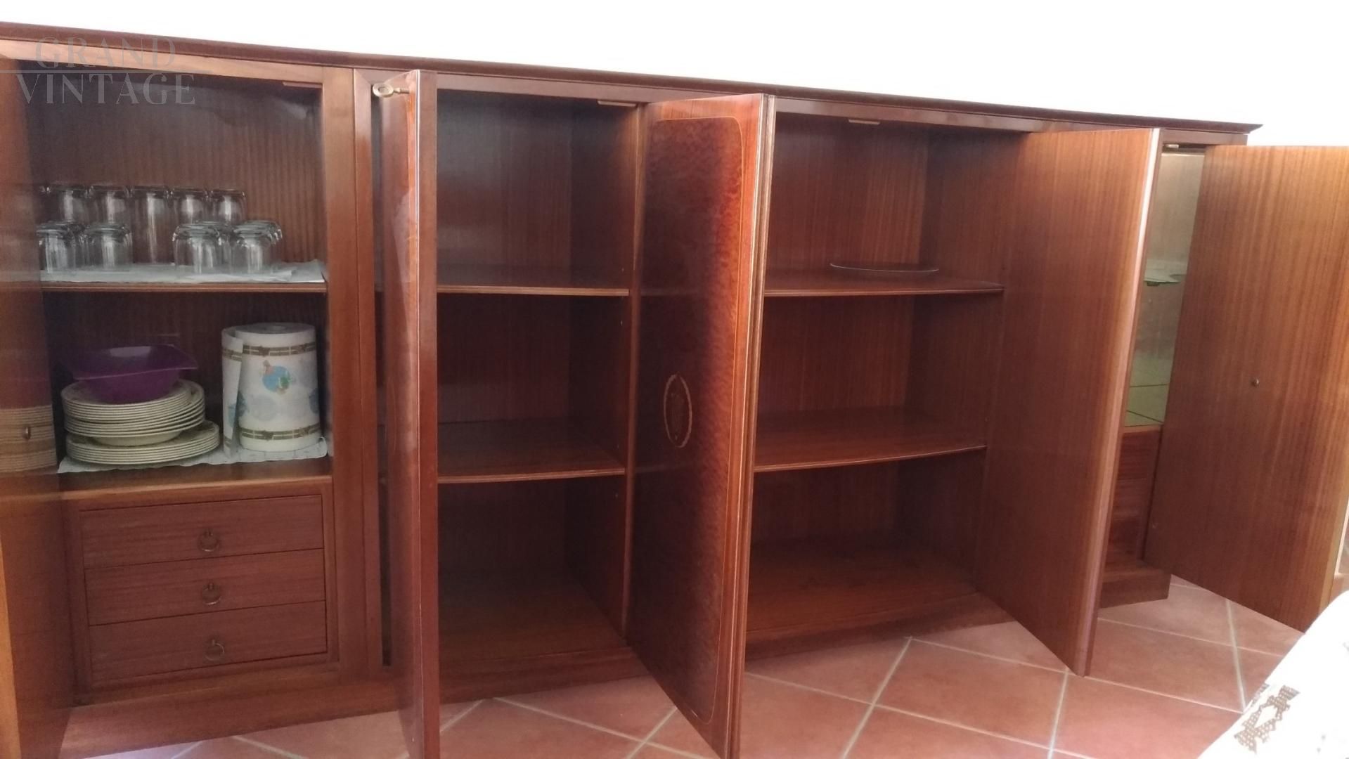 Vintage antique style wooden sideboard buffet cabinet, produced by Mobili Moretti, complete with 5 door compartments and a bar compartment with mirrored shelves and bottom, the two side doors hide 6 drawers each. The furniture is in excellent condition, without scratches, dents or repairs.