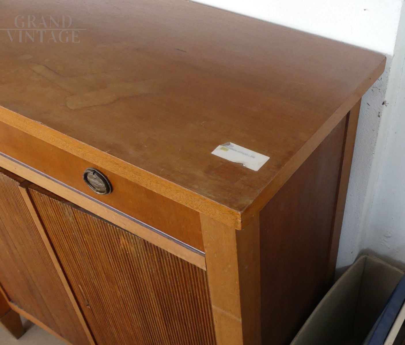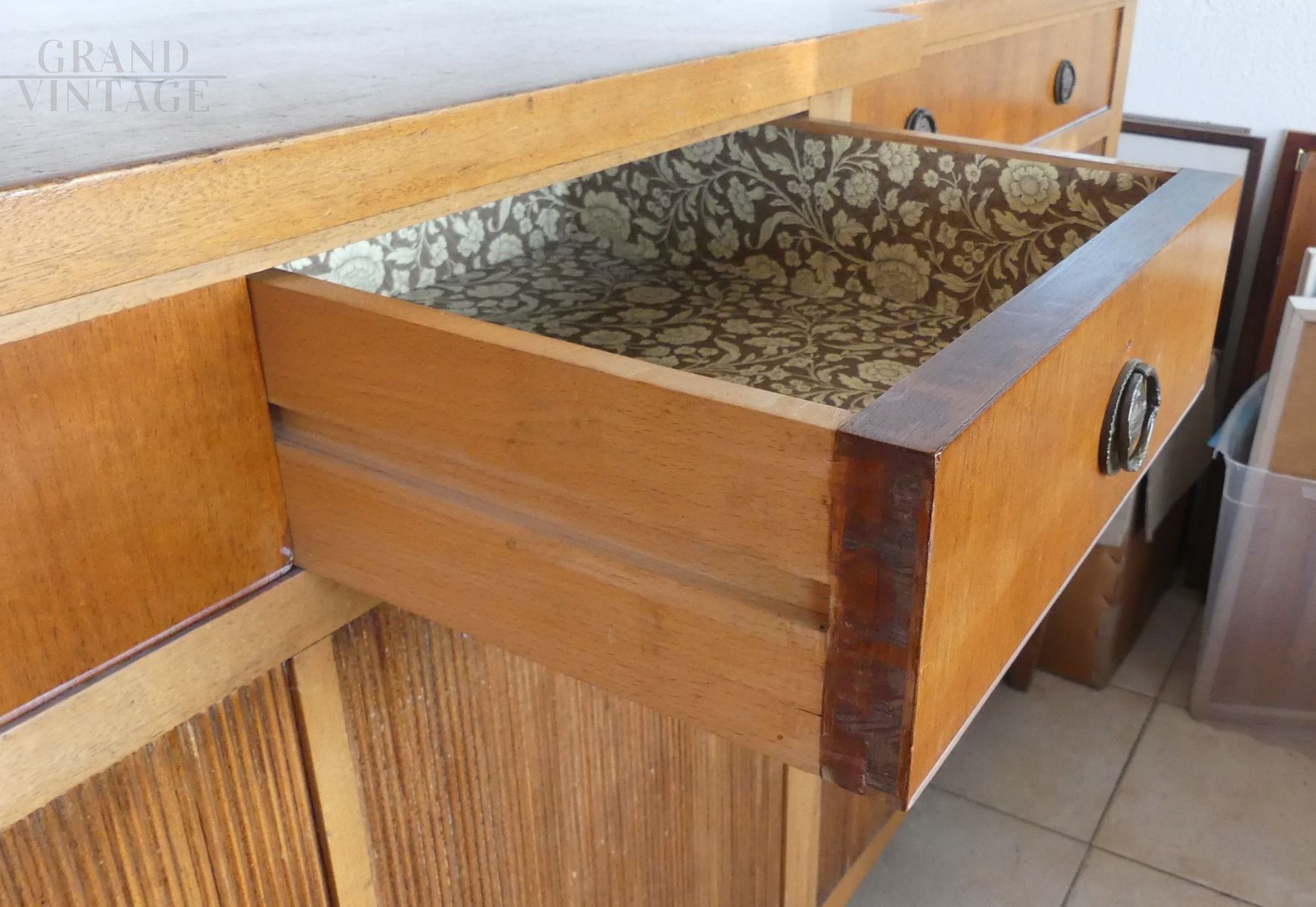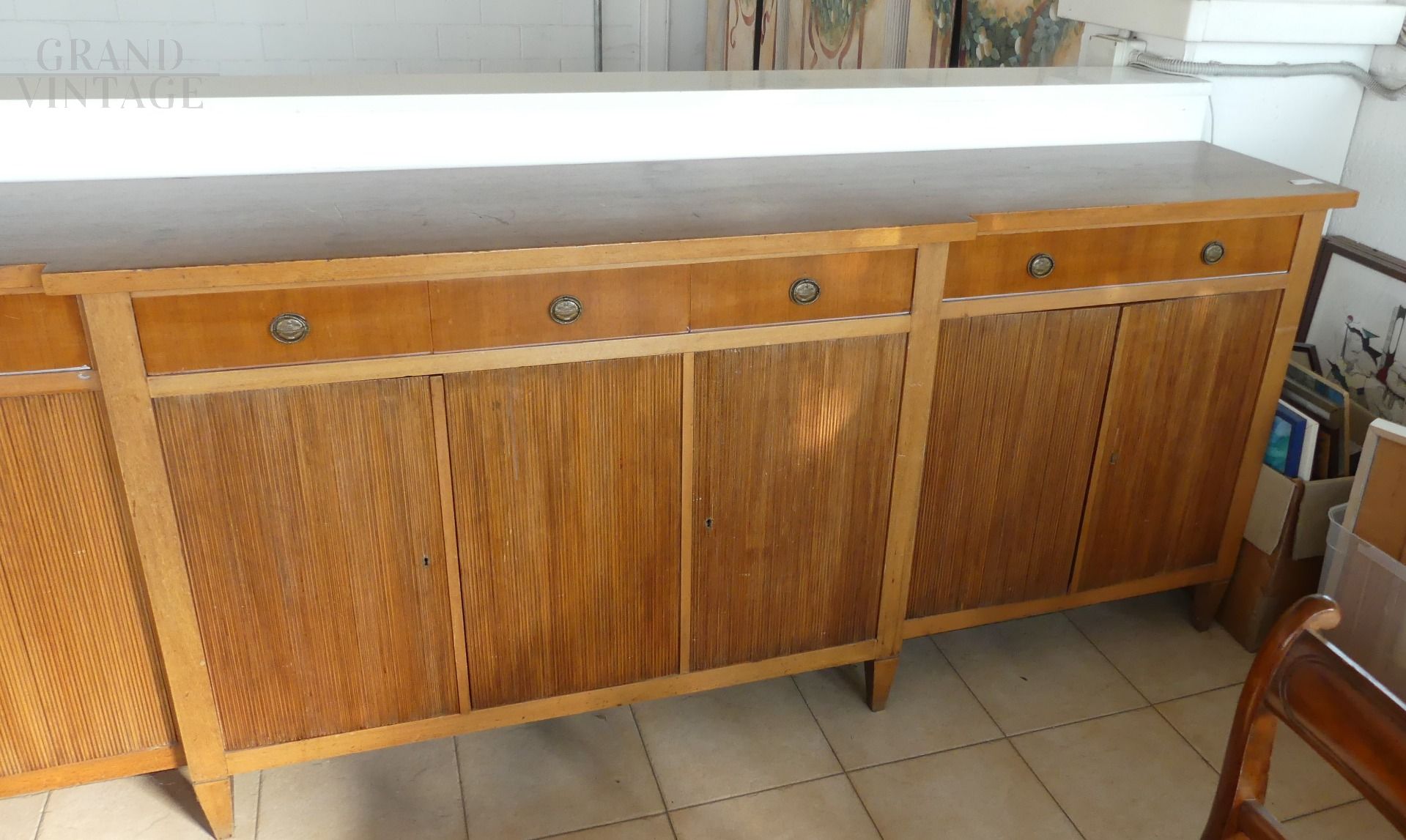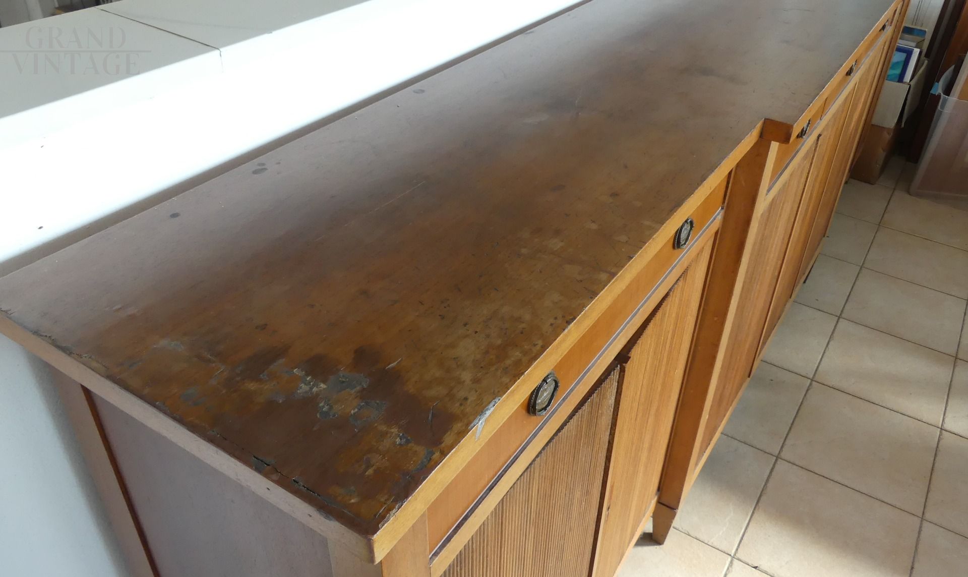 Large vintage sideboard, Italian mid-century from the 1960s, in mahogany wood, composed of 7 doors decorated with a beautiful knurling. In original condition, it has the natural signs of aging, with some stains on the top, as shown in photos.