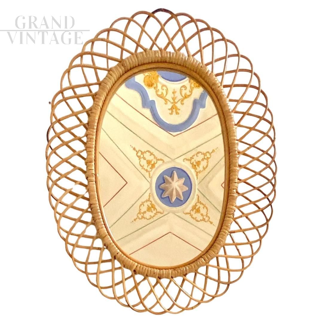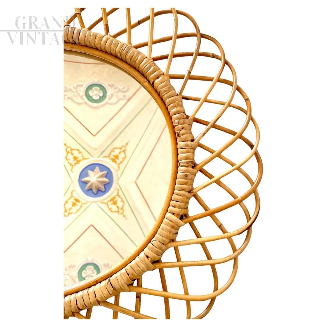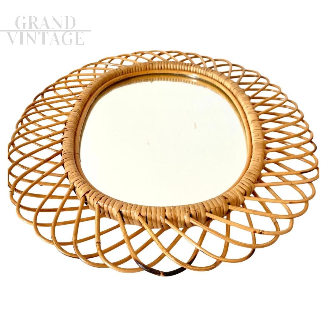 Large Sunburst model mirror in bamboo and rattan in the style of Bonacina, 1960s Italy. Elegant bamboo and rattan wall mirror produced in Italy in the 1960s and designed in the style of Franco Albini and Bonacina. Large model (the medium ones are 67cm x 56cm). Finely finished handcrafted designer piece with curved bamboo and rattan frame. Small signs of oxidation on the bamboo parts (black pieces). Original mirror, without damage or breakages. Excellent condition with only a few signs of wear and use.