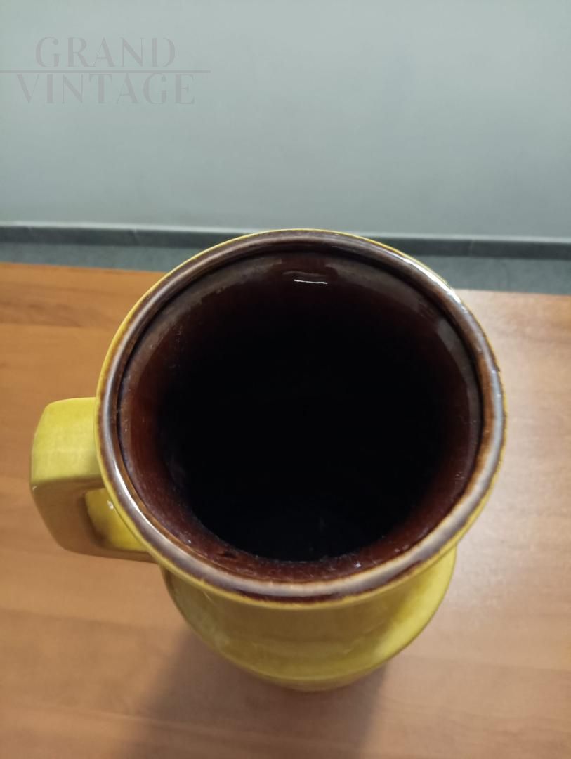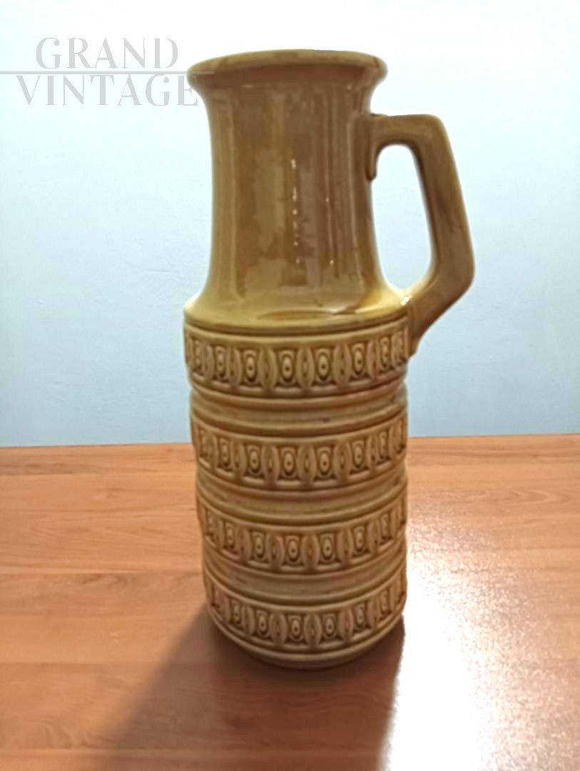Large vintage W. Germany yellow ocher ceramic jug vase with lava pattern, dating to the late 20th century, circa 1970. A bold and vibrant jug with a taste appropriate to the late 20th century. The object shows a beautiful aged patina. The contoured pouring handle joins the tapered neck and accented around the circumference with diamond patterns. The markings on the base read "W. Germany" and a model number of 429-45. The object will be delivered polished and ready to display. Being vintage it has no defects, but may show slight natural signs of use.