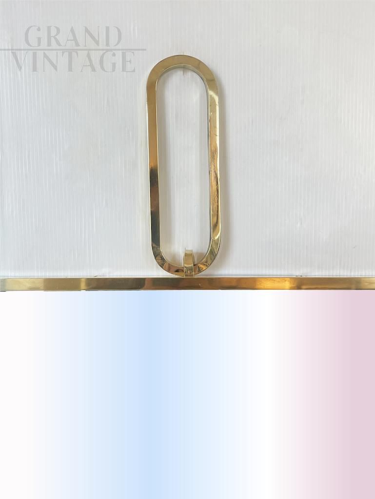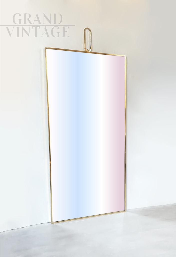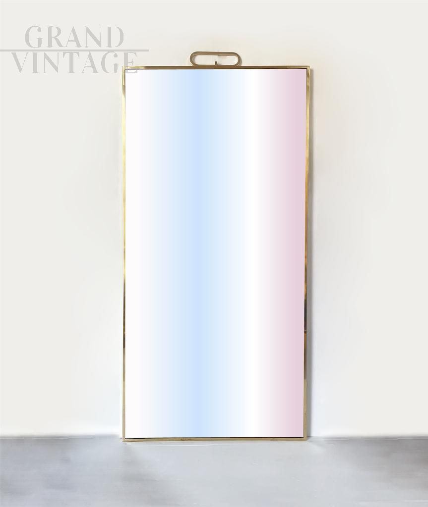 Elegant rectangular vintage mirror with a unique oval-shaped movable hook (18 x 6 cm). Entirely brass frame and wooden structure.