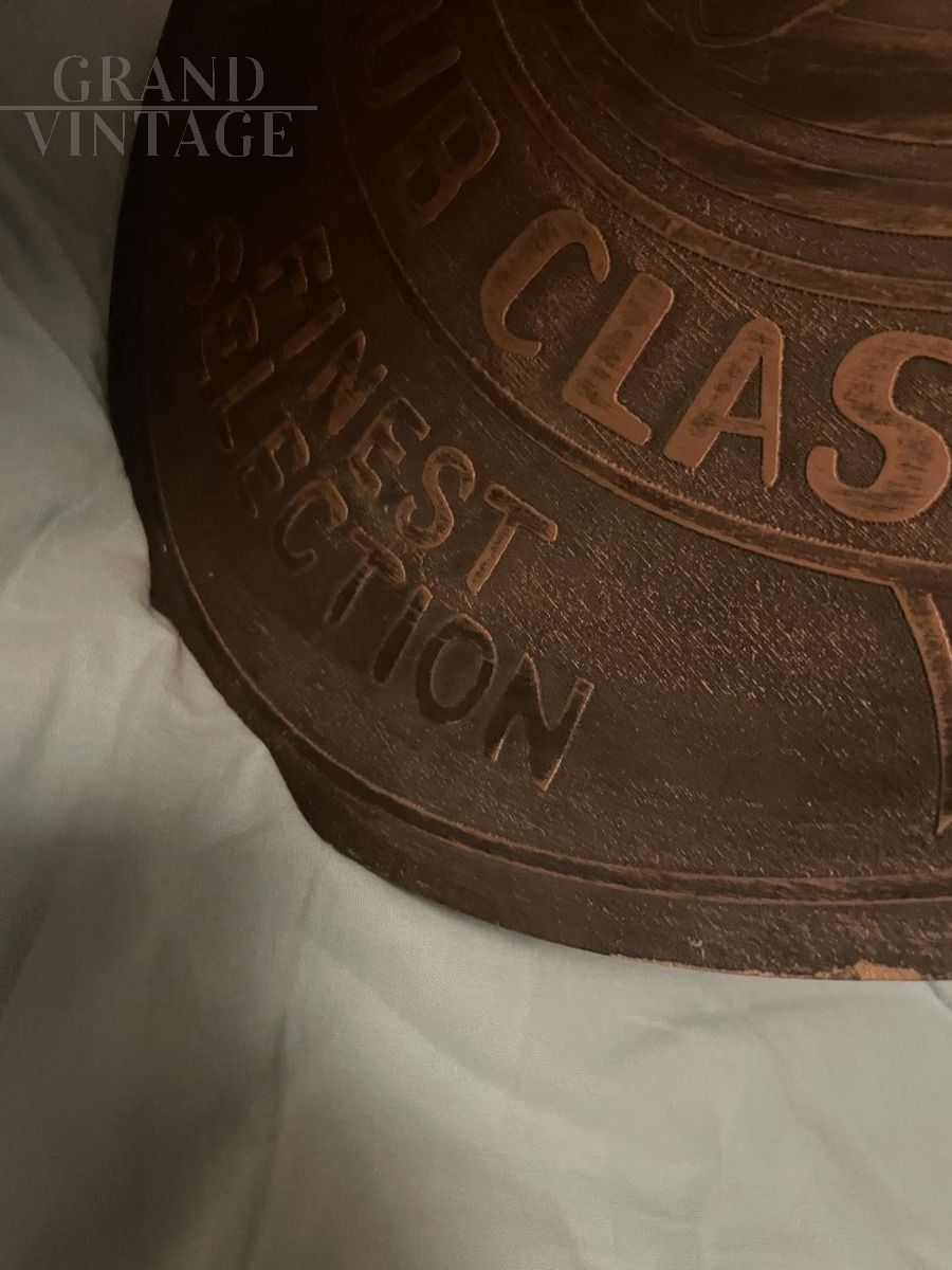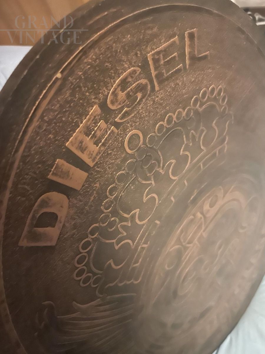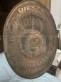Large collectible vintage advertising sign from the Diesel clothing company, oval-shaped in antique-effect wood.