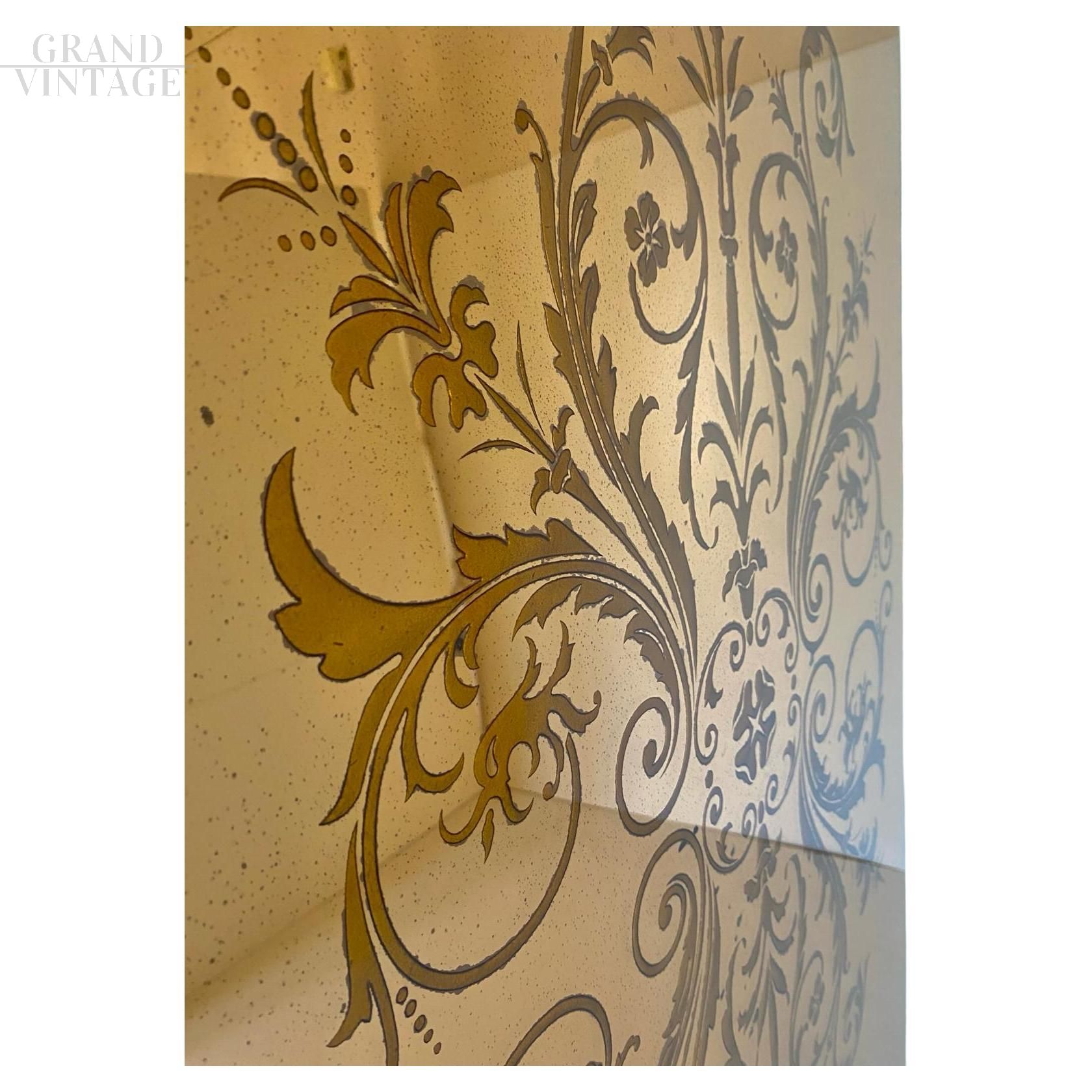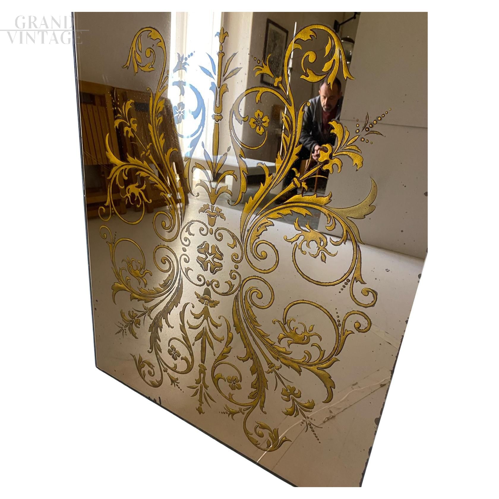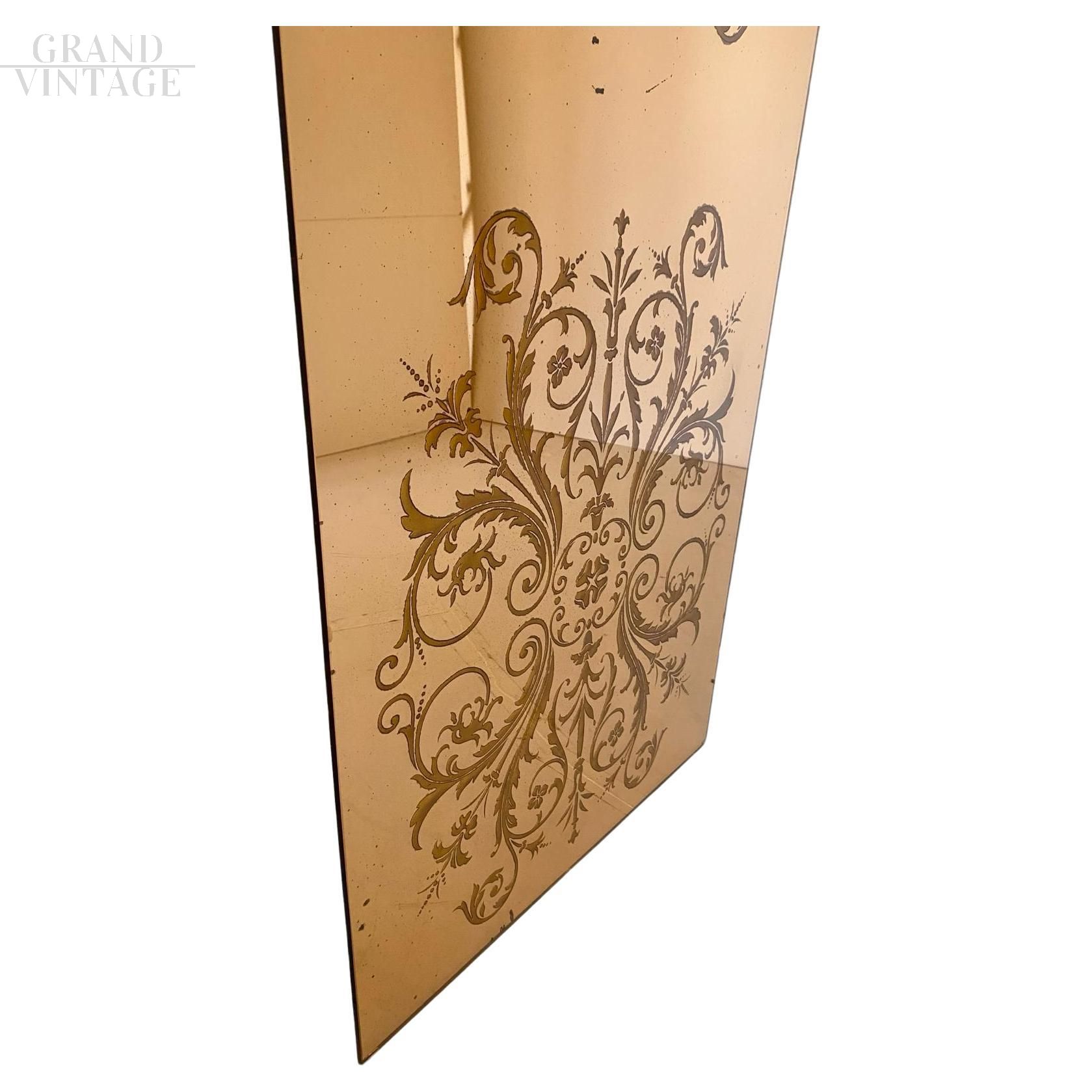 Magnificent rare 1960s full length wall mirror with slightly smoked glass finely decorated inside the glass with floral motifs. The mirror is intact and with beautiful signs of oxidation, in good condition.